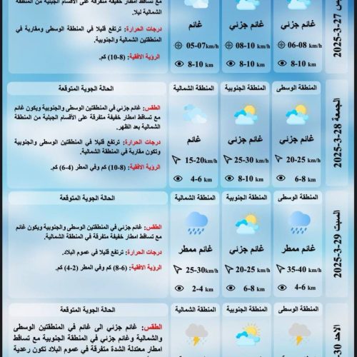 أعلنت هيئة الانواء الجوية، اليوم الاربعاء، حالة الطقس خلال الأيام المقبلة. فيما توقعت الهيئة في بيانها، ان " يكون الطقس ممطراً مع ارتفاع بدرجات الحرارة".