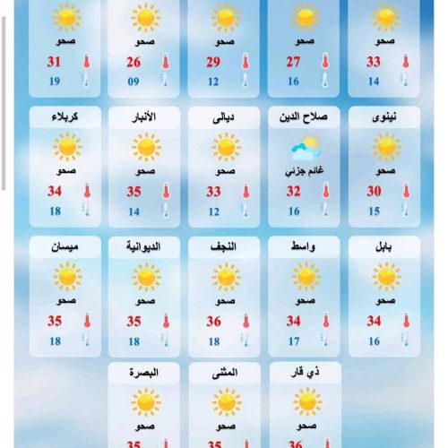 طقس العراق… غبار وارتفاع بدرجات الحرارة خلال الأيام المقبلة طقس العراق… غبار وارتفاع بدرجات الحرارة خلال الأيام المقبلة طقس العراق… غبار وارتفاع بدرجات الحرارة خلال الأيام المقبلة طقس العراق… غبار وارتفاع بدرجات الحرارة خلال الأيام المقبلة أعلنت هيئة الانواء الجوية، اليوم الاحد، حالة الطقس خلال الأيام المقبلة.