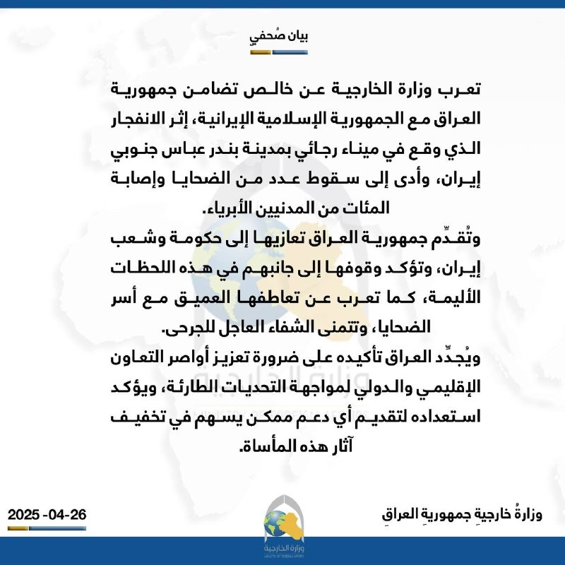 سياسةالعراق يعزي إيران بضحايا انفجار ميناء شهيد رجائي: نقف إلى جانبهم قبل 8 أشهر 34 مشاهدات شارك العراق يعزي إيران بضحايا انفجار ميناء شهيد رجائي: نقف إلى جانبهمالعراق يعزي إيران بضحايا انفجار ميناء شهيد رجائي: نقف إلى جانبهم الوسومإيرانالعراقانفجارشهيدقد يهمك أيضا سياسة المجلس السياسي الوطني يعلن الاتفاق على آليات تسهل حسم اختيار رئيس مجلس النواب قبل 3 ساعات 10 مشاهدات الحكم الرابع الـVAR يتلاعب بدورينا .. تفاصيل صادمة في الحكم الرابع قبل 4 ساعات 10 مشاهدات عربي ودولي الحكومة الليبية تعلن مقتل رئيس الأركان محمد الحداد ومرافقيه اثر تحطم طائرتهم في أنقرة قبل 4 ساعات 19 مشاهدات عربي ودولي مقتل رئيس الأركان الليبي "محمد الحداد" ومرافقيه بتحطم طائرتهم أثناء عودتهم من أنقرة قبل 4 ساعات 16 مشاهدات عربي ودولي وسائل إعلام تركية: العثور على حطام طائرة رئيس الاركان الليبي التي سقطت بعد إقلاعها من أنقرة قبل 4 ساعات 9 مشاهدات