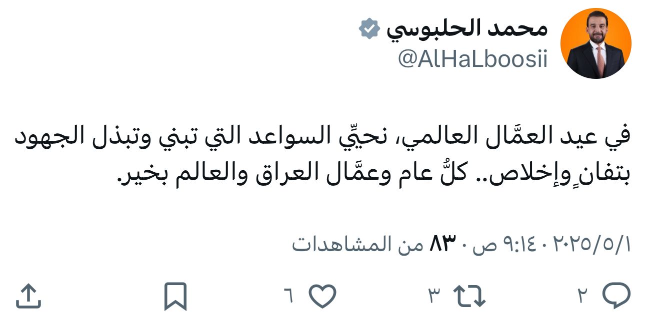 محلياترئيس حزب تقدم الرئيس محمد الحلبوسي يهنئ العمال بعيدهم: نحيِّي السواعد التي تبني وتبذل الجهود بتفانٍ وإخلاص قبل 7 أشهر 40 مشاهدات شارك الرئيس الحلبوسي: إنصاف المظلومين واجب إنساني عملنا عليه منذ بداية تشكيل الحكومةرئيس حزب تقدم الرئيس محمد الحلبوسي يهنئ العمال بعيدهم: نحيِّي السواعد التي تبني وتبذل الجهود بتفانٍ وإخلاص الوسومالحلبوسيالعمالحزب تقدمقد يهمك أيضا عربي ودولي موسكو: قد يتم عقد لقاء بين بوتين وترامب في القريب العاجل قبل 17 دقيقة 3 مشاهدات رياضة "توالي الأزمات".. ليفربول يوجه ضربة قوية لمحمد صلاح ويقرر بيعه قبل 52 دقيقة 5 مشاهدات عربي ودولي الرئيس اللبناني يطالب مجلس الأمن بالضغط على إسرائيل لتطبيق وقف إطلاق النار قبل ساعة واحدة 5 مشاهدات محليات العدل تعلن إطلاق سراح 761 نزيلاً خلال تشرين الثاني قبل ساعتين 11 مشاهدات عربي ودولي ارتفاع عدد ضحايا الفيضانات والانهيارات الأرضية في إندونيسيا إلى 846 قبل ساعتين 12 مشاهدات