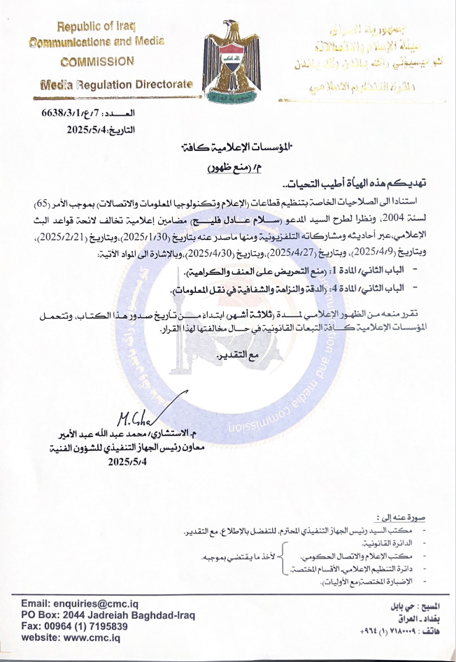 محلياتهيئة الاعلام والاتصالات تمنع "سلام عادل فليح" من الظهور الاعلامي لمدة ثلاثة اشهر.. وثيقة قبل 7 أشهر 106 مشاهدات شارك هيئة الاعلام والاتصالات تمنع "سلام عادل فليح" من الظهور الاعلامي لمدة ثلاثة اشهر.. وثيقةهيئة الاعلام والاتصالات تمنع "سلام عادل فليح" من الظهور الاعلامي لمدة ثلاثة اشهر.. وثيقة الوسومالاعلام والاتصالاتهيئة الاعلام والاتصالاتوثيقةقد يهمك أيضا عربي ودولي موسكو: قد يتم عقد لقاء بين بوتين وترامب في القريب العاجل قبل 37 دقيقة 5 مشاهدات رياضة "توالي الأزمات".. ليفربول يوجه ضربة قوية لمحمد صلاح ويقرر بيعه قبل ساعة واحدة 7 مشاهدات عربي ودولي الرئيس اللبناني يطالب مجلس الأمن بالضغط على إسرائيل لتطبيق وقف إطلاق النار قبل ساعة واحدة 8 مشاهدات محليات العدل تعلن إطلاق سراح 761 نزيلاً خلال تشرين الثاني قبل ساعتين 11 مشاهدات عربي ودولي ارتفاع عدد ضحايا الفيضانات والانهيارات الأرضية في إندونيسيا إلى 846 قبل ساعتين 12 مشاهدات