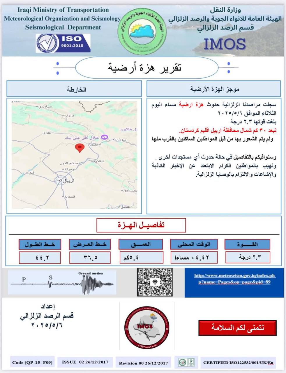 محلياتتسجيل حدوث هزة ارضية بقوة 2,3 درجة شمال محافظة اربيل قبل 7 أشهر 28 مشاهدات شارك هزة أرضيةتسجيل حدوث هزة ارضية بقوة 2,3 درجة شمال محافظة اربيل الوسوماربيلمحافظةهزة ارضيةقد يهمك أيضا رياضة إعلان حرب.. ريال مدريد يجهز تقريرًا للفيفا حول قضية نيجريرا قبل 4 دقائق 3 مشاهدات عربي ودولي الأردن.. سيناريو حل البرلمان وتعديل الدستور يعود للواجهة قبل 9 دقائق 3 مشاهدات عربي ودولي إيران تعلن تفكيك خلية تابعة لجماعة "خلق" في طهران قبل 17 دقيقة 4 مشاهدات عربي ودولي أكسيوس: ترامب يعتزم إعلان بدء المرحلة الثانية من اتفاق غزة قبل عيد الميلاد قبل 27 دقيقة 4 مشاهدات محليات طقس العراق.. أمطار رعدية وانخفاض بدرجات الحرارة خلال الأيام المقبلة قبل ساعة واحدة 7 مشاهدات
