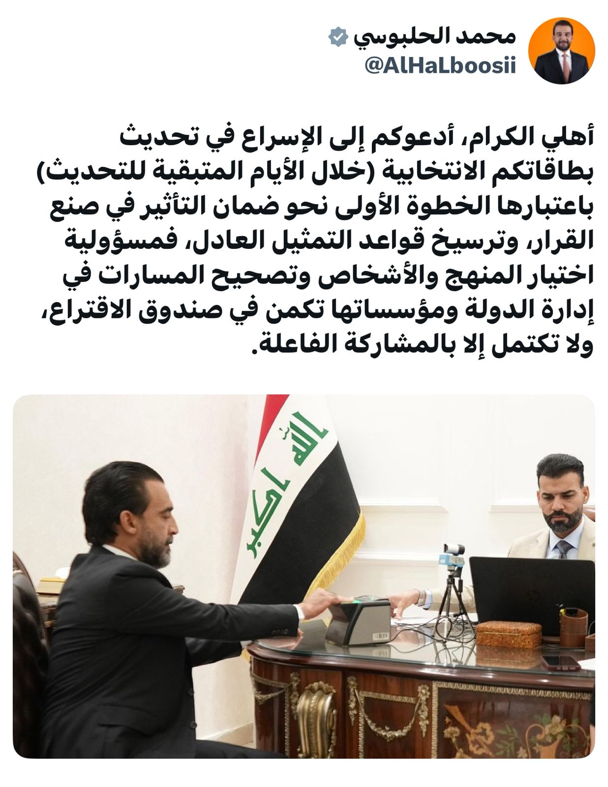 سياسةالرئيس الحلبوسي: تحديث البطاقات الانتخابية خطوة أولى نحو ضمان التأثير في صنع القرار قبل 7 أشهر 16 مشاهدات شارك رئيس حزب "تقدم" الرئيس محمد الحلبوسي يدعو إلى الإسراع في تحديث البطاقات الانتخابيةرئيس حزب "تقدم" الرئيس محمد الحلبوسي يدعو إلى الإسراع في تحديث البطاقات الانتخابية الوسومالرئيس الحلبوسيقد يهمك أيضا محليات العدل تعلن إطلاق سراح 761 نزيلاً خلال تشرين الثاني قبل 6 دقائق 2 مشاهدات عربي ودولي ارتفاع عدد ضحايا الفيضانات والانهيارات الأرضية في إندونيسيا إلى 846 قبل 32 دقيقة 2 مشاهدات عربي ودولي الإعلام الإسرائيلي بعد مقتل أبو شباب: "حماس" اخترقت مناطق سيطرتنا قبل ساعة واحدة 6 مشاهدات عربي ودولي الولايات المتحدة تقلص مدة تصاريح عمل المهاجرين إلى 18 شهرا قبل ساعة واحدة 7 مشاهدات عربي ودولي تفاصيل جديدة.. غارة أميركية تقتل عميلا سرياً في سوريا بدل قيادي داعشي قبل ساعتين 8 مشاهدات