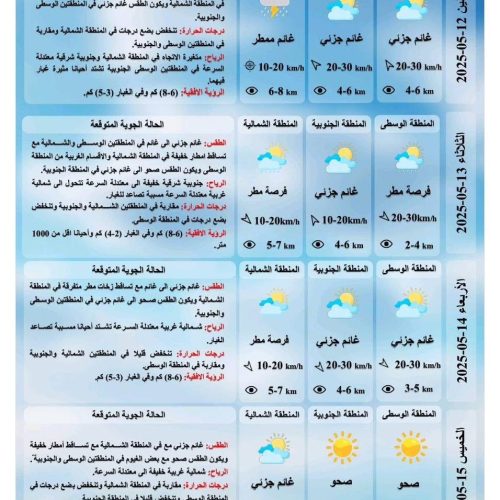 طقس العراق… غبار وانخفاض بدرجات الحرارة خلال الأيام المقبلة طقس العراق… غبار وانخفاض بدرجات الحرارة خلال الأيام المقبلة طقس العراق… غبار وانخفاض بدرجات الحرارة خلال الأيام المقبلة طقس العراق… غبار وانخفاض بدرجات الحرارة خلال الأيام المقبلة أعلنت هيئة الأنواء الجوية عن حالة الطقس للأيام المقبلة، وتوقعت انخفاضاً في درجات الحرارة مع حدوث غبار.