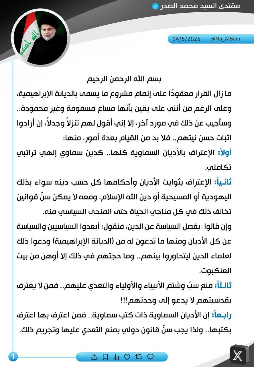 محلياتالسيد الصدر يضع 6 شروط لاثبات حسن النوايا بشأن مشروع الديانة الابراهيمية قبل 7 أشهر 23 مشاهدات شارك السيد الصدر يدعو إلى تظاهرة يوم الجمعة المقبل تنديداً بالعدوان على غزة السيد الصدر يضع 6 شروط لاثبات حسن النوايا بشأن مشروع الديانة الابراهيمية السيد الصدر يضع 6 شروط لاثبات حسن النوايا بشأن مشروع الديانة الابراهيمية الوسومالسيد الصدرقد يهمك أيضا أقتصاد مصرف الرشيد ينفي عدم توفر سيولة أو الاستيلاء على أموال الزبائن قبل 4 دقائق 2 مشاهدات محليات بالوثيقة.. صدور مذكرة قبض بحق "حسين العنكوشي" بتهمة إهانة رمز ديني بطريقة علنية قبل 11 دقيقة 4 مشاهدات أقتصاد العمل تعلن إطلاق راتب المعين المتفرغ لشهر كانون الأول قبل 39 دقيقة 8 مشاهدات عربي ودولي حماس: الاحتلال يعرقل الانتقال للمرحلة الثانية من اتفاق وقف إطلاق النار في غزة قبل 41 دقيقة 5 مشاهدات عربي ودولي وزير الخارجية السوري: العلاقات مع روسيا تدخل مرحلة جديدة قبل ساعة واحدة 6 مشاهدات