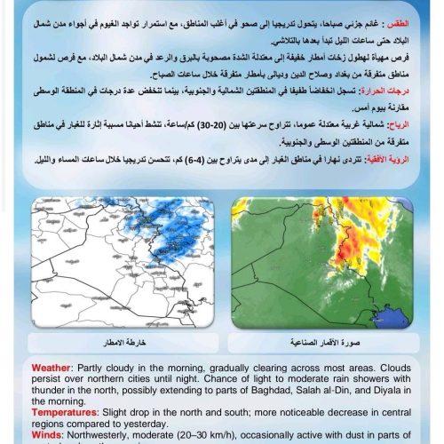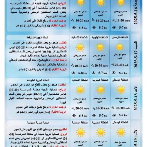 أعلنت هيئة الأنواء الجوية، اليوم الخميس، حالة طقس العراق خلال الأيام المقبلة، فيما أشارت إلى تصاعد للغبار وارتفاع في درجات الحرارة.