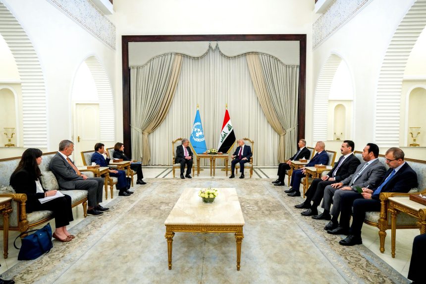 استقبل رئيس الجمهورية عبد اللطيف جمال رشيد، اليوم الجمعة 16 أيار 2025 في قصر السلام ببغداد، الأمين العام للأمم المتحدة أنطونيو غوتيرش والوفد المرافق، والذي يزور العراق للمشاركة في أعمال القمة العربية في بغداد بدورتها (34).