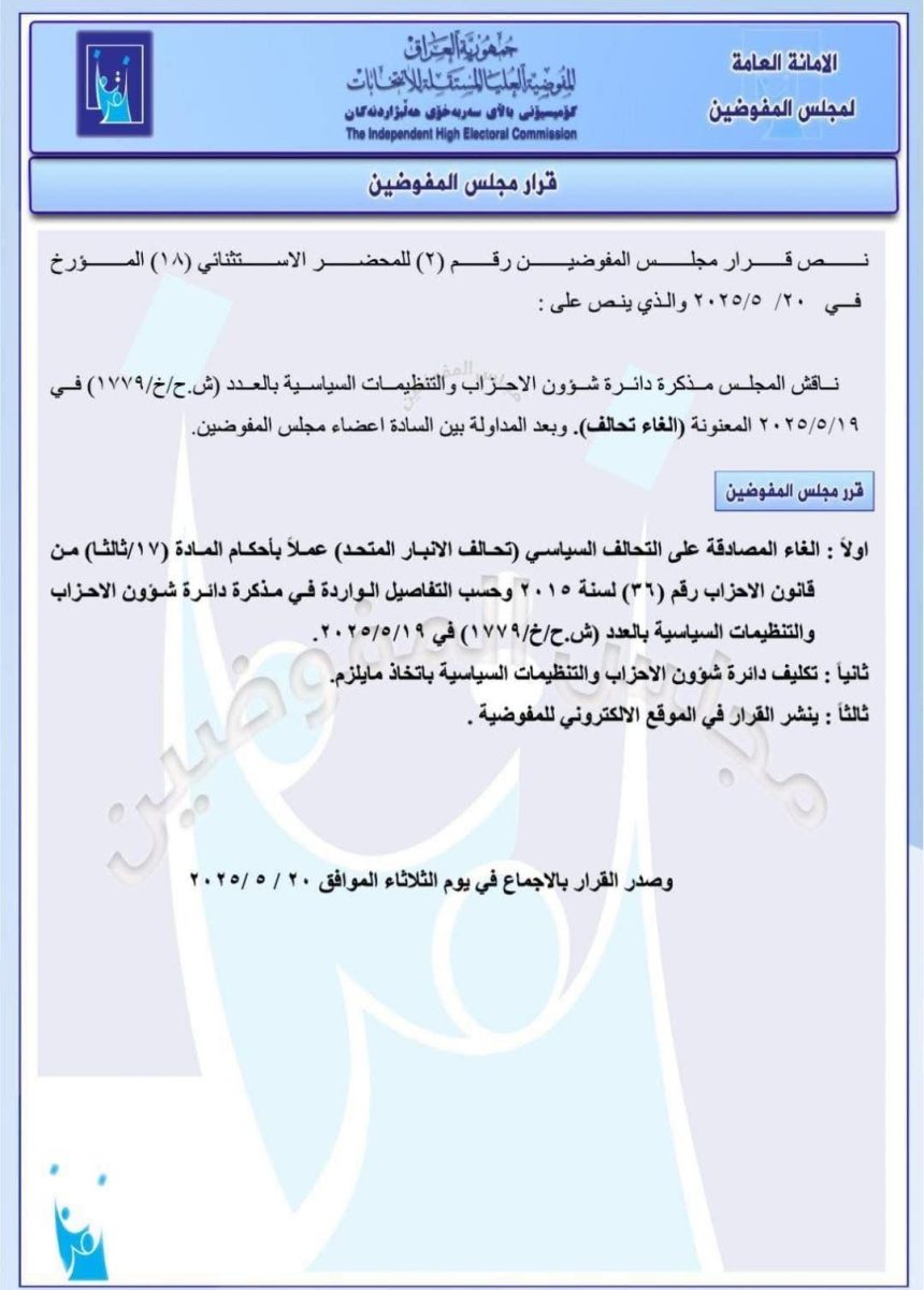 سياسةبالوثيقة.. المفوضية تقرر إلغاء المصادقة على تحالف الأنبار المتحد قبل 7 أشهر 31 مشاهدات شارك بالوثيقة.. المفوضية تقرر إلغاء المصادقة على تحالف الأنبار المتحد الوسومالمفوضيةبالوثيقةتحالف الأنبارقد يهمك أيضا عربي ودولي ترامب يعلن تصنيف مادة "الفنتانيل" المخدرة سلاح دمار شامل قبل 34 دقيقة 6 مشاهدات محليات عمليات بغداد: نقترب من فتح جميع الطرق بعد إزالة الكتل الكونكريتية قبل ساعة واحدة 7 مشاهدات محليات طقس العراق.. أمطار رعدية وتصاعد للغبار خلال الأيام المقبلة قبل ساعتين 10 مشاهدات أقتصاد النفط يتراجع بفعل محادثات أوكرانيا وبيانات ضعيفة من الصين قبل ساعتين 7 مشاهدات رياضة المنتخب الاردني يهزم نظيره السعودي ويبلغ نهائي كأس العرب قبل 11 ساعة 15 مشاهدات
