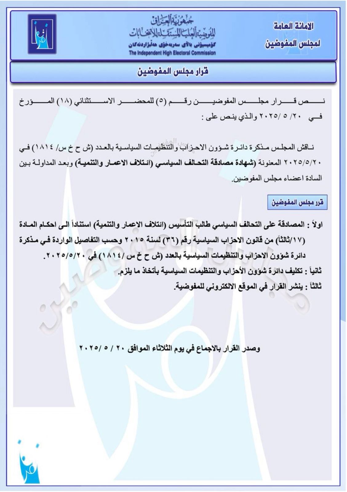 سياسةمفوضية الانتخابات تصادق على ائتلاف "الإعمار والتنمية” برئاسة السوداني قبل 7 أشهر 12 مشاهدات شارك مفوضية الانتخاباتمفوضية الانتخابات تصادق على ائتلاف "الإعمار والتنمية” برئاسة السوداني الوسومالسودانيمفوضية الانتخاباتقد يهمك أيضا أمن الاستخبارات العسكرية تحبط عملية تهريب مشتقات نفطية وتلقي القبض على منفذها في نينوى قبل 20 دقيقة 3 مشاهدات سياسة القاضي زيدان: الدستور نص على انتخاب رئيس مجلس النواب ونائبيه في الجلسة الأولى وأي اجتهاد يعد مخالفة دستورية قبل 36 دقيقة 5 مشاهدات سياسة مجلس ذي قار يصوّت على اختيار هيثم عزيز محافظاً قبل 42 دقيقة 6 مشاهدات سياسة مجلس محافظة ذي قار يصوت بالموافقة على استقالة المحافظ مرتضى الإبراهيمي قبل ساعة واحدة 5 مشاهدات محليات التربية تصدر قراراً يخص الطلبة الراسبين في مدارس المتميزين وثانويات كلية بغداد قبل ساعة واحدة 11 مشاهدات