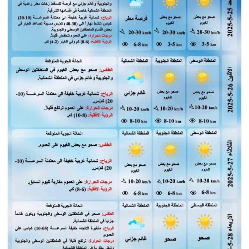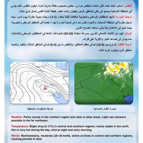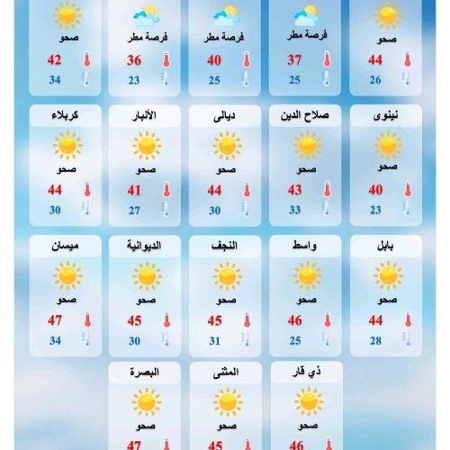 أعلنت هيئة الأنواء الجوية، حالة طقس العراق خلال الأيام المقبلة، فيما أشارت إلى ارتفاع درجات الحرارة وتصاعد للغبار.