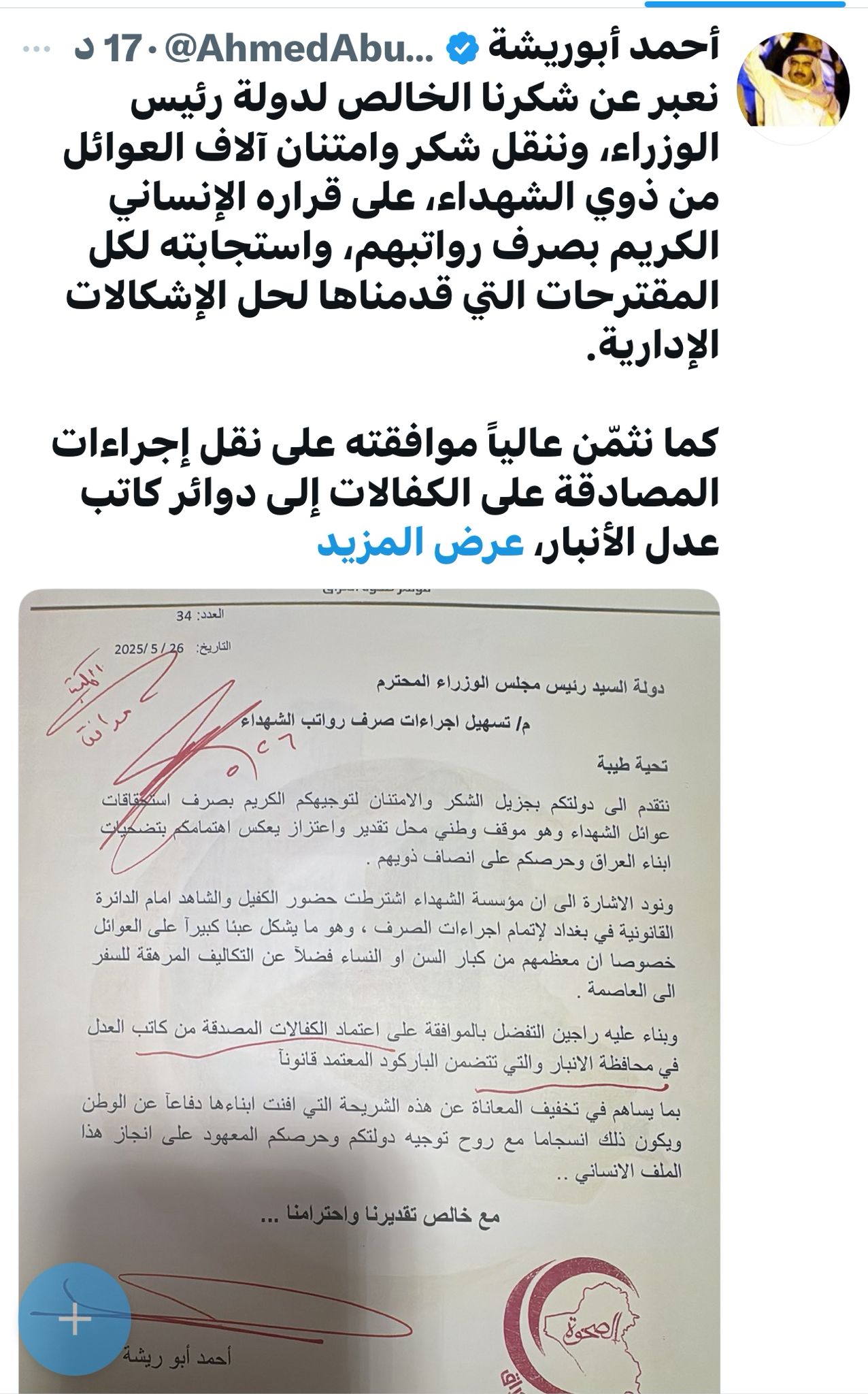محلياتالشيخ ابو ريشة يشكر السوداني على صرف رواتب ذوي الشهداء ونقل المصادقة على الكفالات إلى دوائر عدل الأنبار قبل 6 أشهر 21 مشاهدات شارك الشيخ أحمد أبو ريشة: على الدول الاسلامية أن تدافع عن دستورها وتقف موقفاً كموقف العراق ضد إرهاب الكراهية الشيخ ابو ريشة يشكر السوداني على صرف رواتب ذوي الشهداء ونقل المصادقة على الكفالات إلى دوائر عدل الأنبار الوسومابو ريشةالأنبارالسودانيذوي الشهداءرواتبقد يهمك أيضا عربي ودولي نعيم قاسم: ننتظر من الحكومة اللبنانية أن تبين لنا بطولاتها بإيقاف العدوان وتحرير الأسرى والإعمار قبل 4 دقائق 1 مشاهدة رياضة أخطاء كارثية وكرات ساخنة.. كوابيس الماضي تحاصر قرعة كأس العالم قبل 14 دقيقة 3 مشاهدات عربي ودولي حماس: وافقنا على تشكيل لجنة تكنوقراط لحكم غزة قبل 26 دقيقة 6 مشاهدات رياضة عرض سعودي ضخم لضم رافينيا يربك حسابات برشلونة قبل 30 دقيقة 5 مشاهدات محليات الصحة: نصف النزلاء في مستشفى الرشاد متماثلون للشفاء لكن ذويهم يرفضون استلامهم قبل 56 دقيقة 8 مشاهدات