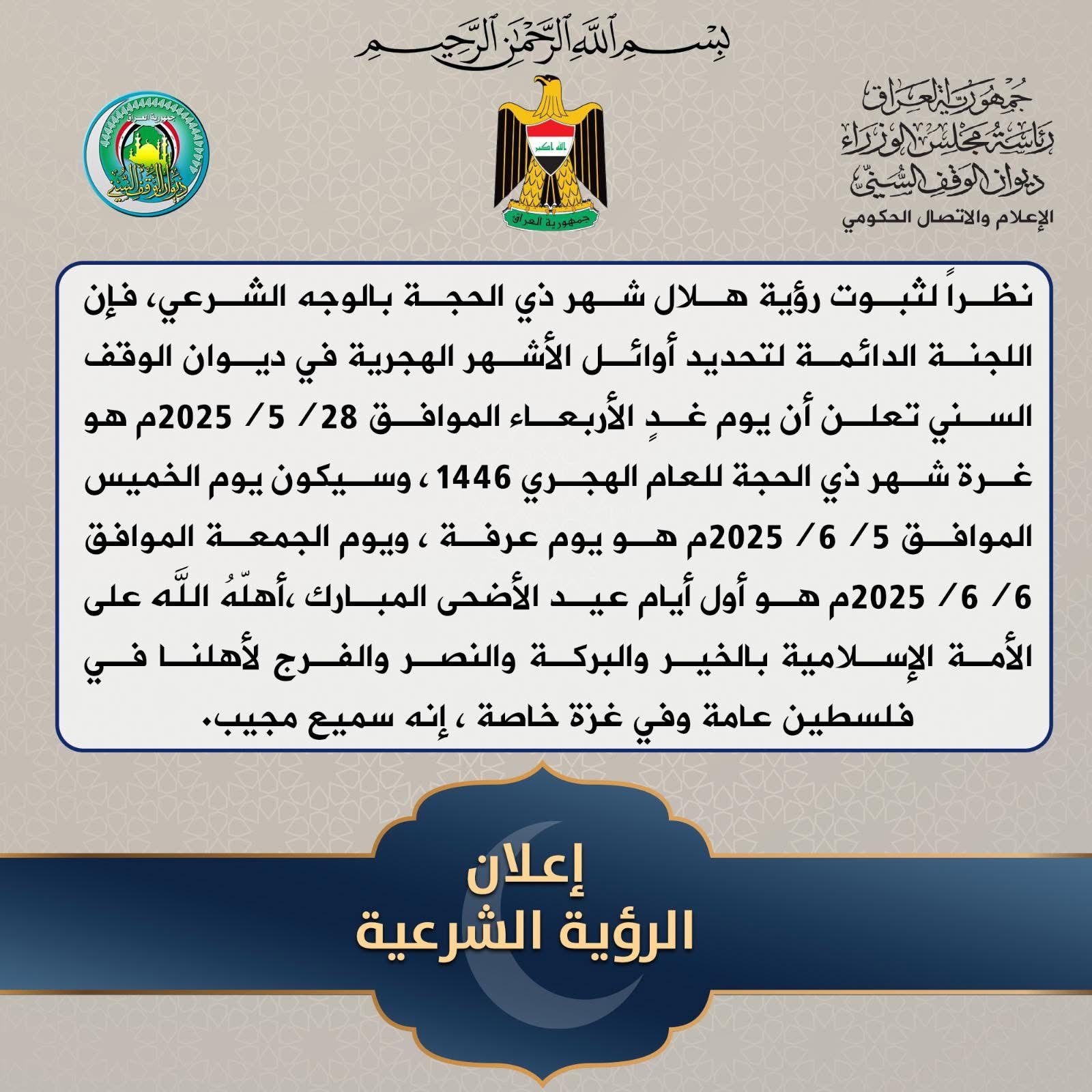 محلياتالوقف السني: يوم غد الأربعاء غرة شهر ذي الحجة وعيد الأضحى الجمعة 6 حزيران قبل 6 أشهر 22 مشاهدات شارك ديوان الوقف السني: لم نعلن لغاية الآن موعد غرة شهر شوال وبانتظار قرار اللجنة الفلكية والشرعيةالوقف السني: يوم غد الأربعاء غرة شهر ذي الحجة وعيد الأضحى الجمعة 6 حزيران الوسومالجمعةالوقف السنيشهر ذي الحجةعيد الأضحىغرةقد يهمك أيضا رياضة قائد السودان قبل مواجهة العراق: نتجاوز فواجع الحرب بكرة القدم والفوز "يوم عيد" قبل 31 دقيقة 3 مشاهدات علوم وتكنولوجيا خلل فني يوقف عمل منصات ومواقع عالمية على الإنترنت قبل 56 دقيقة 7 مشاهدات عربي ودولي نعيم قاسم: ننتظر من الحكومة اللبنانية أن تبين لنا بطولاتها بإيقاف العدوان وتحرير الأسرى والإعمار قبل ساعة واحدة 7 مشاهدات رياضة أخطاء كارثية وكرات ساخنة.. كوابيس الماضي تحاصر قرعة كأس العالم قبل ساعة واحدة 6 مشاهدات عربي ودولي حماس: وافقنا على تشكيل لجنة تكنوقراط لحكم غزة قبل ساعة واحدة 11 مشاهدات