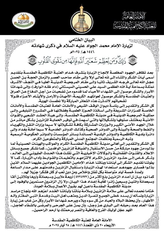 محلياتالعتبة الكاظمية: أكثر من أربعة ملايين و734 ألف زائر أحيوا ذكرى شهادة الإمام محمد الجواد (ع) قبل 7 أشهر 21 مشاهدات شارك العتبة الكاظمية: أكثر من أربعة ملايين و734 ألف زائر أحيوا ذكرى شهادة الإمام محمد الجواد (ع)العتبة الكاظمية: أكثر من أربعة ملايين و734 ألف زائر أحيوا ذكرى شهادة الإمام محمد الجواد (ع) الوسومالعتبة الكاظميةزائرقد يهمك أيضا سياسة المجلس السياسي الوطني يعلن الاتفاق على آليات تسهل حسم اختيار رئيس مجلس النواب قبل 8 ساعات 12 مشاهدات الحكم الرابع الـVAR يتلاعب بدورينا .. تفاصيل صادمة في الحكم الرابع قبل 8 ساعات 11 مشاهدات عربي ودولي الحكومة الليبية تعلن مقتل رئيس الأركان محمد الحداد ومرافقيه اثر تحطم طائرتهم في أنقرة قبل 8 ساعات 21 مشاهدات عربي ودولي مقتل رئيس الأركان الليبي "محمد الحداد" ومرافقيه بتحطم طائرتهم أثناء عودتهم من أنقرة قبل 8 ساعات 20 مشاهدات عربي ودولي وسائل إعلام تركية: العثور على حطام طائرة رئيس الاركان الليبي التي سقطت بعد إقلاعها من أنقرة قبل 8 ساعات 11 مشاهدات