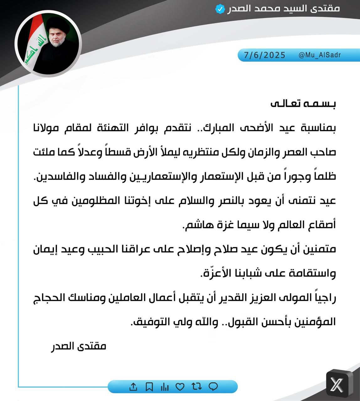 محلياتالسيد الصدر مهنئا: نتمنى أن يكون عيد صلاح وإصلاح على عراقنا الحبيب وعيد استقامة على شبابنا قبل 6 أشهر 44 مشاهدات شارك السيد الصدر السيد الصدر مهنئا: نتمنى أن يكون عيد صلاح وإصلاح على عراقنا الحبيب وعيد استقامة على شبابنا الوسومالسيد الصدرصلاحقد يهمك أيضا عربي ودولي الإعلام الإسرائيلي بعد مقتل أبو شباب: "حماس" اخترقت مناطق سيطرتنا قبل 16 دقيقة 4 مشاهدات عربي ودولي الولايات المتحدة تقلص مدة تصاريح عمل المهاجرين إلى 18 شهرا قبل 31 دقيقة 6 مشاهدات عربي ودولي تفاصيل جديدة.. غارة أميركية تقتل عميلا سرياً في سوريا بدل قيادي داعشي قبل 41 دقيقة 7 مشاهدات سياسة المفوضية تحدّد آلية منح مقعد المرشح المستبعد: يحل محله أعلى الخاسرين من نفس الكتلة قبل ساعة واحدة 6 مشاهدات عربي ودولي الأمم المتحدة: عودة أكثر من 378 ألف لاجئ سوري من لبنان إلى بلادهم قبل ساعة واحدة 6 مشاهدات