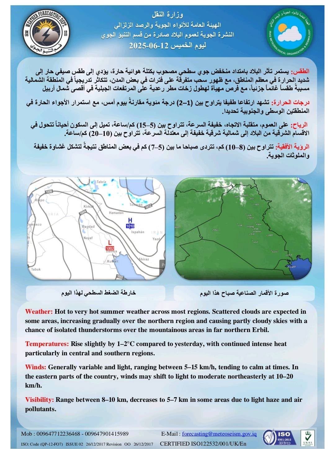وذكر بيان للهيئة تلقته “الرشيد”، أن “غداً الجمعة سيكون الطقس صحواً على العموم يتحول بعد الظهر إلى غائم فوق المرتفعات الجبلية في المنطقة الشمالية، ودرجات الحرارة ترتفع قليلاً في عموم البلاد”، مبيناً أن “درجات الحرارة العظمى ليوم غدٍ الجمعة ، كالتالي: بغداد والبصرة وواسط وبابل وميسان وذي قار والديوانية والمثنى والنجف الأشرف 49، كربلاء المقدسة وديالى 48، صلاح الدين والأنبار وكركوك 47 ، السليمانية 42، نينوى 46، دهوك 41، أربيل 44”.