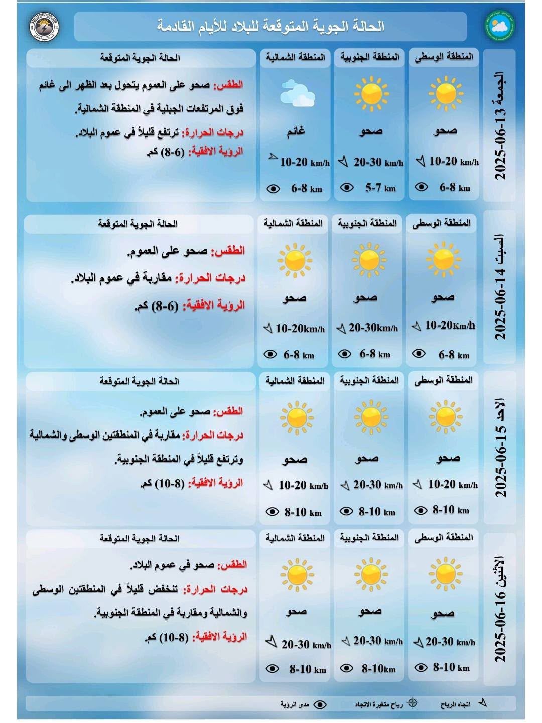 وتابع، أن “يوم الاثنين سيكون الطقس صحواً في عموم البلاد، ودرجات الحرارة تنخفض قليلاً في المنطقتين الوسطى والشمالية ومقاربة في المنطقة الجنوبية”