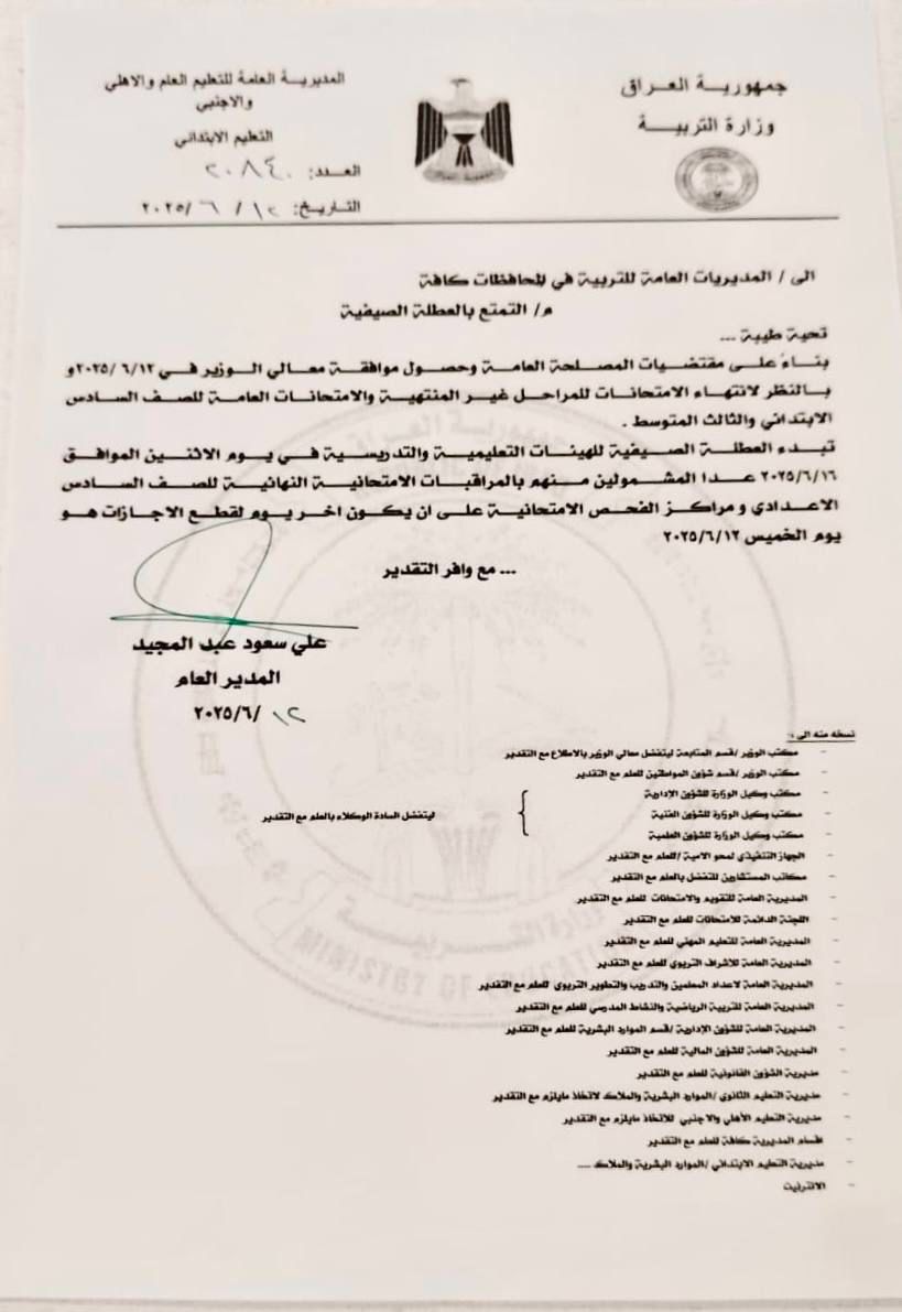 محلياتالتربية تحدد الإثنين المقبل موعداً لبدء العطلة الصيفية للهيئات التعليمية والتدريسية قبل 6 أشهر 21 مشاهدات شارك وزارة التربية التربية تحدد الإثنين المقبل موعداً لبدء العطلة الصيفية للهيئات التعليمية والتدريسية الوسومالتربيةقد يهمك أيضا رياضة منتخب المغرب يقع في مجموعة البرازيل وانجلترا تصطدم بكرواتيا في قرعة المونديال قبل 4 دقائق 1 مشاهدة رياضة حدث تاريخي.. 3 رؤساء دول يشاركون في سحب قرعة المونديال قبل 17 دقيقة 2 مشاهدات عربي ودولي قرار جديد من مجموعة السبع والاتحاد الأوروبي: فرض حظر كامل على النفط الروسي قبل 31 دقيقة 3 مشاهدات رياضة الفيفا يمنح جائزة السلام 2025 لدونالد ترامب قبل ساعة واحدة 7 مشاهدات أمن العراق يعلن إنشاء "بنك معلومات وطني" للأسلحة قبل ساعة واحدة 6 مشاهدات