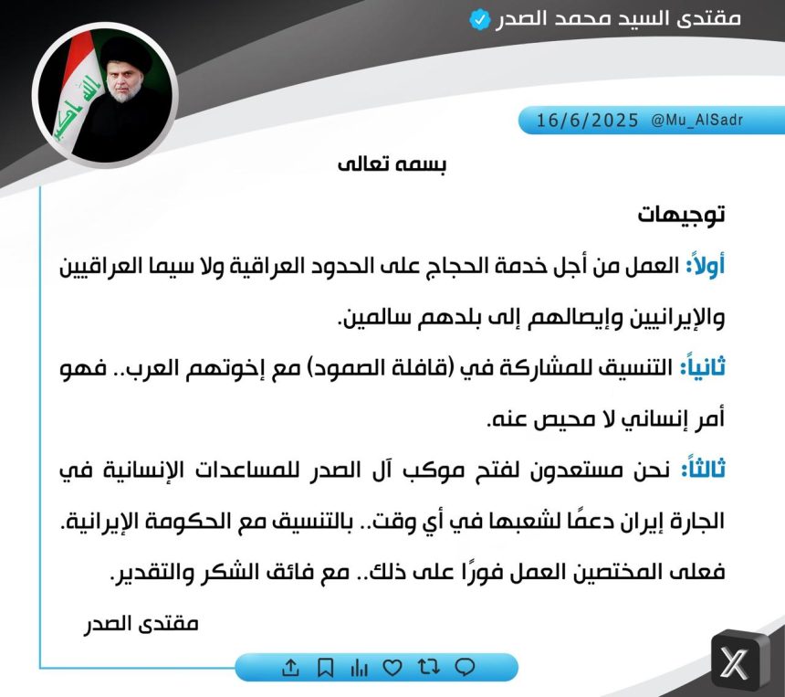 محلياتالسيد الصدر يوجّه بالتنسيق للمشاركة بـ”قافلة الصمود” وفتح موكب آل الصدر للمساعدات الإنسانية في إيران قبل 6 أشهر 53 مشاهدات شارك السيد الصدر يوجّه بالتنسيق للمشاركة بـ"قافلة الصمود" وفتح موكب آل الصدر للمساعدات الإنسانية في إيران الوسومإيرانالسيد الصدرقد يهمك أيضا رياضة المنتخب الاولمبي العراقي يخسر امام نظيره السعودي في نهائي كأس الخليج قبل 12 دقيقة 6 مشاهدات سياسة مجلس الوزراء يقرر إعفاء عدد من المسؤولين وتدوير آخرين بقضية تجميد أموال الارهابيين قبل 18 دقيقة 3 مشاهدات سياسة "الرشيد" تنشر نص قرارات مجلس الوزراء في جلسة اليوم قبل 22 دقيقة 4 مشاهدات سياسة الخارجية ترحب بقرار الحكومة السويسرية رفع حظر السفر المفروض على عدد من المدن العراقية قبل 52 دقيقة 8 مشاهدات عربي ودولي حماس تتهم إسرائيل بانتهاك اتفاق وقف إطلاق النار في غزة أكثر من 800 مرة قبل ساعتين 7 مشاهدات