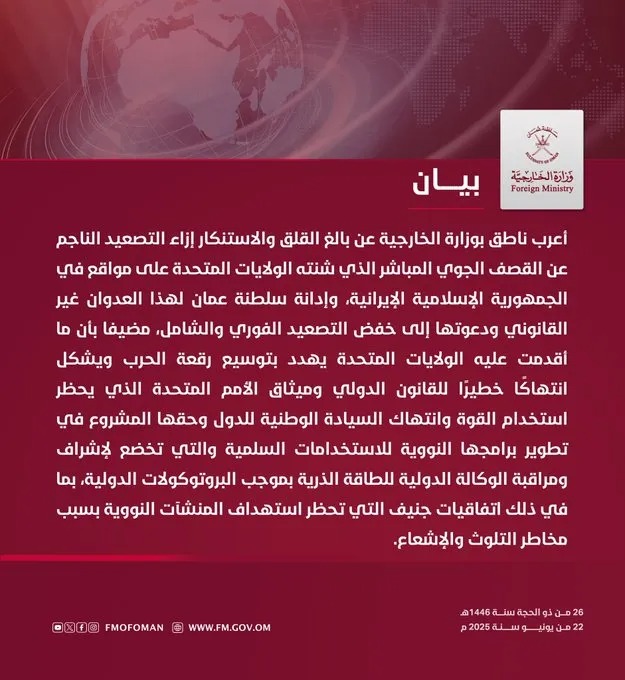 عربي ودوليالخارجية العمانية: استهداف أميركا لإيران يهدد بتوسيع نطاق الحرب ويمثل انتهاكاً للقانون الدولي قبل 6 أشهر 11 مشاهدات شارك الخارجية العمانية: استهداف أميركا لإيران يهدد بتوسيع نطاق الحرب ويمثل انتهاكاً للقانون الدولي الوسومأميركااستهدافالحربالخارجية العمانيةقد يهمك أيضا عربي ودولي أردوغان حول جهود التسوية في أوكرانيا: السلام ليس ببعيد ونحن نرى ذلك قبل دقيقة واحدة 1 مشاهدة رياضة قضية فساد تهدد مشاركة الأرجنتين في مونديال 2026 قبل 23 دقيقة 3 مشاهدات سياسة غوتيريش: مستمرون بدعم العراق من خلال أطر تعاون جديدة تتناسب مع المرحلة المقبلة قبل 48 دقيقة 6 مشاهدات سياسة رئيس مجلس القضاء الأعلى يدعو القوى والشخصيات السياسية لإنجاز الاستحقاقات الدستورية في اختيار الرئاسات الثلاث قبل ساعة واحدة 5 مشاهدات عربي ودولي إعلام إيراني: احتجاز 18 من أفراد طاقم ناقلة أجنبية احتجزت في خليج عمان قبل ساعتين 6 مشاهدات