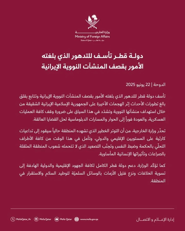 عربي ودوليالخارجية القطرية: نأسف للتدهور الذي بلغته الأمور بقصف المنشآت النووية الإيرانية قبل 6 أشهر 14 مشاهدات شارك الخارجية القطرية: نأسف للتدهور الذي بلغته الأمور بقصف المنشآت النووية الإيرانية الوسومالخارجية القطريةقد يهمك أيضا محليات تعليق الرحلات الجوية في مطار اربيل الدولي بسبب الضباب الكثيف قبل 21 دقيقة 9 مشاهدات سياسة الإطار التنسيقي يؤكد أهمية استمرار الحوارات بين الأطراف السياسية لحسم ملف تشكيل الحكومة قبل 23 دقيقة 2 مشاهدات سياسة الإطار التنسيقي يدعو إلى عقد جلسة مجلس النواب في أقرب وقت ممكن قبل 25 دقيقة 3 مشاهدات الثامنة الإطار يجتمع للحسم.. دخان أبيض أم استمرار الاحتراق قبل 34 دقيقة 7 مشاهدات محليات محافظ ميسان يوجه بتقليص الدوام الرسمي في الدوائر والمؤسسات الحكومية بالمحافظة قبل ساعة واحدة 10 مشاهدات