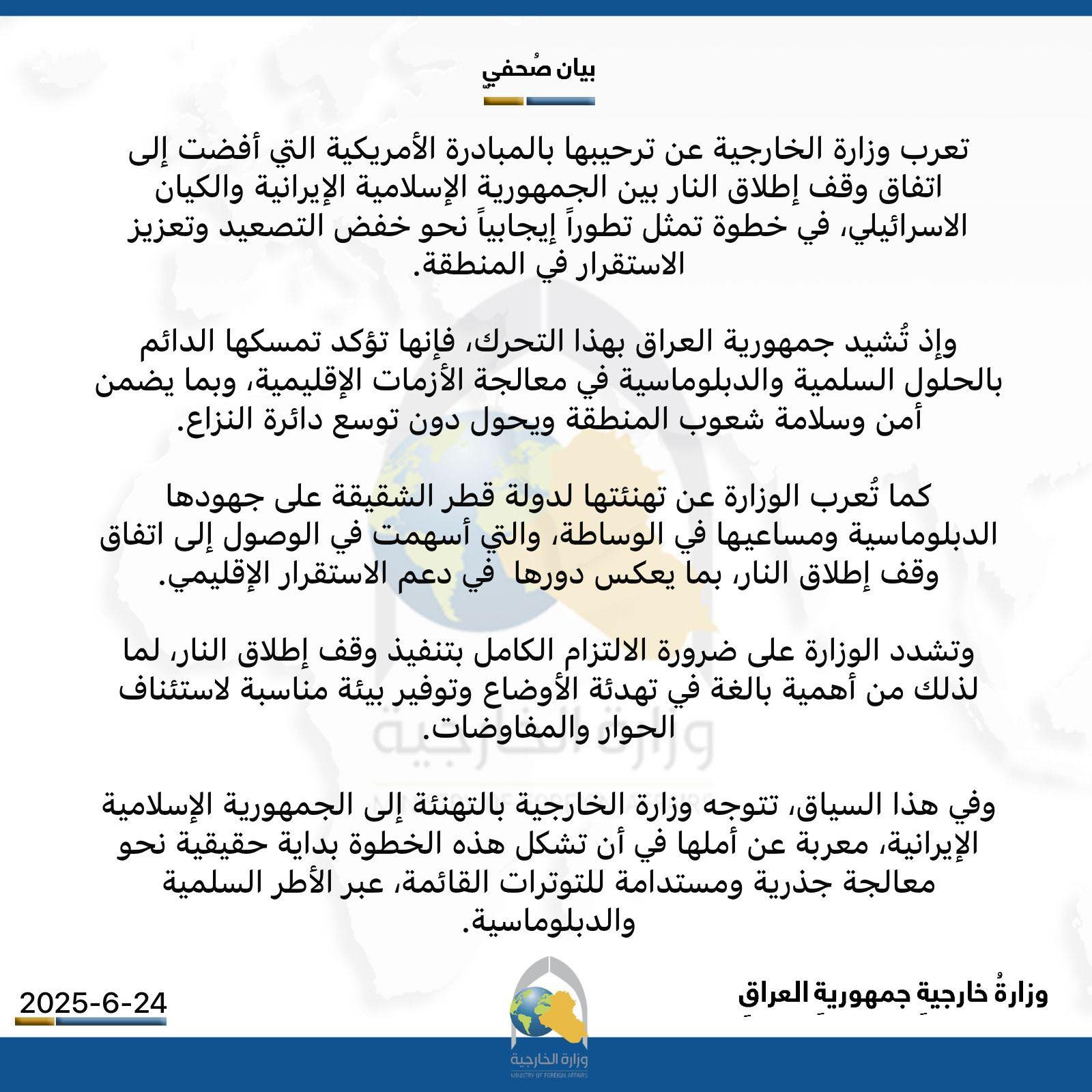 سياسةالعراق يرحب باتفاق وقف إطلاق النار بين إيران وإسرائيل قبل 5 أشهر 43 مشاهدات شارك العراق يرحب باتفاق وقف إطلاق النار بين إيران وإسرائيلالعراق يرحب باتفاق وقف إطلاق النار بين إيران وإسرائيل الوسومإيرانالعراقوقف إطلاق النارقد يهمك أيضا عربي ودولي بالرصاص الحي والغاز السام.. إسرائيل تقتحم بلدات الضفة الغربية قبل 6 دقائق 2 مشاهدات محليات طقس العراق.. أمطار وعواصف رعدية وسيول خلال الأيام المقبلة قبل 19 دقيقة 6 مشاهدات سياسة المبعوث الأميركي إلى سوريا: فشلنا في العراق فتح المجال أمام إيران لملء الفراغ قبل 50 دقيقة 5 مشاهدات أمن مقتل شاب برصاصة أطلقها منتسب أمني بالخطأ خلال "مشاجرة اعتيادية" في أبي غريب غربي بغداد قبل 10 ساعات 9 مشاهدات رياضة مدرب الأرجنتين معلقاً على قرعة المونديال: منتخب الجزائر قوي والأردن مجهول بالنسبة لي قبل 10 ساعات 20 مشاهدات