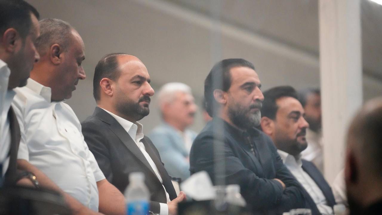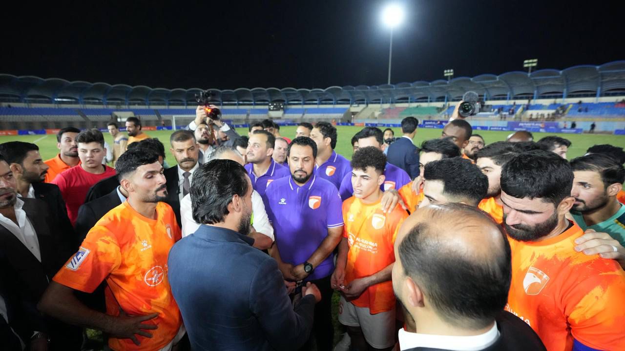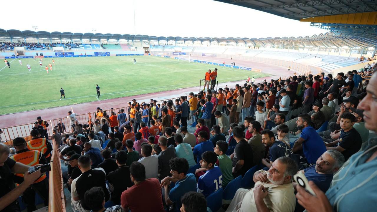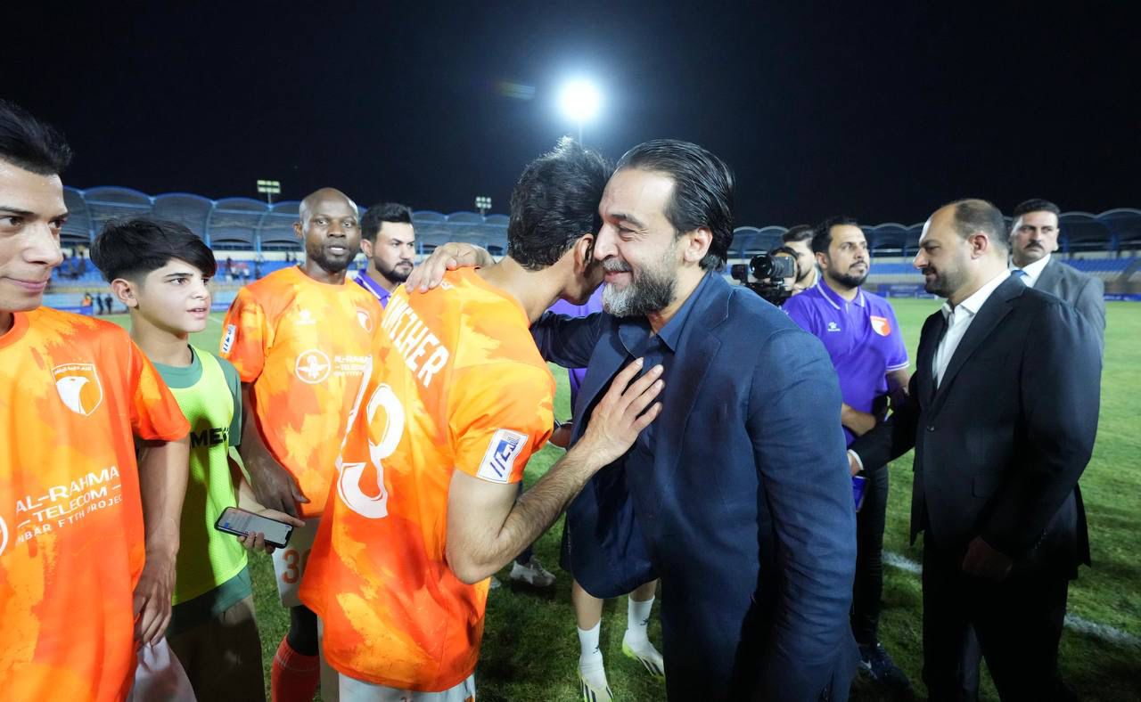 جانب من حضور رئيس حزب تقدم الرئيس محمد الحلبوسي، يرافقه محافظ الأنبار ورئيس مجلس المحافظة، مباراة نادي الكرمة وزاخو على معلب نادي الرمادي.