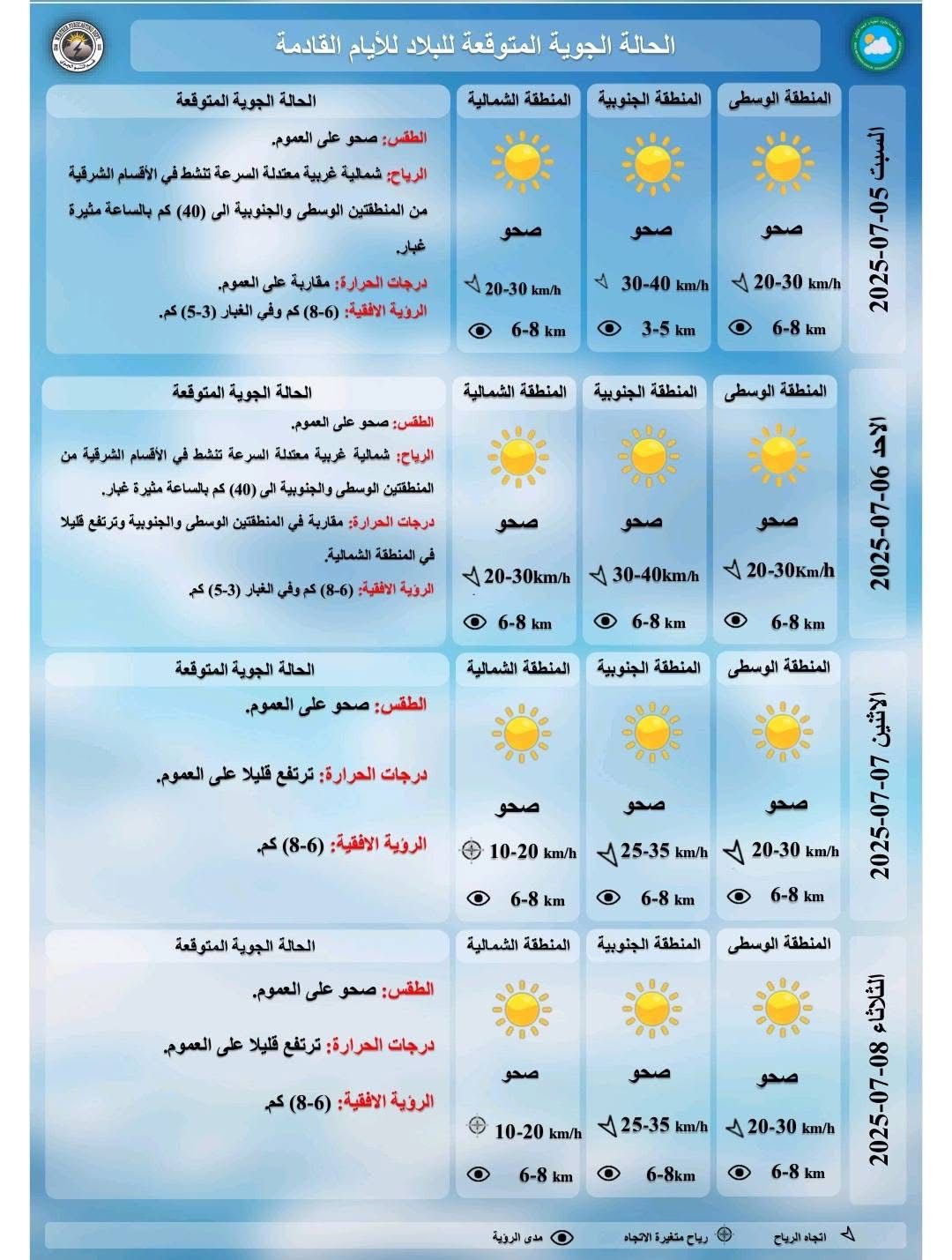 ادأعلنت هيئة الأنواء الجوية، اليوم الجمعة، حالة طقس العراق خلال الأيام المقبلة، فيما أشارت إلى ارتفاع درجات الحرارة.