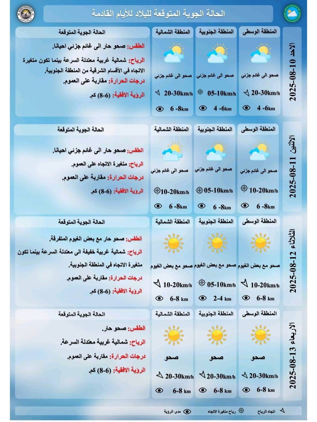 طقس العراق.. بغداد و6 محافظات أخرى تسجل نصف درجة الغليان يوم غد قبل 4 أشهر شارك طقس العراق.. بغداد و6 محافظات أخرى تسجل نصف درجة الغليان يوم غد