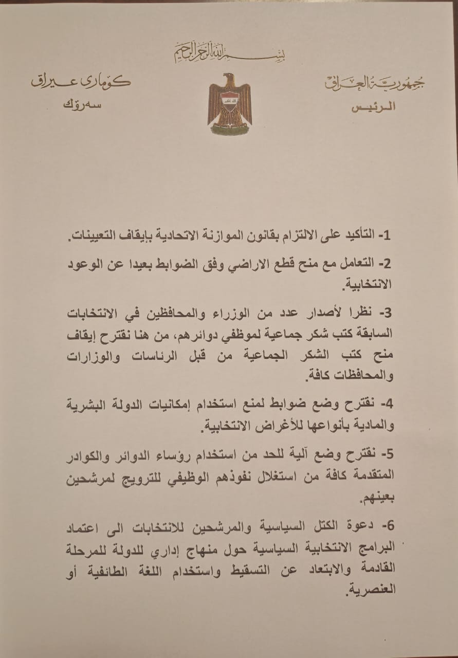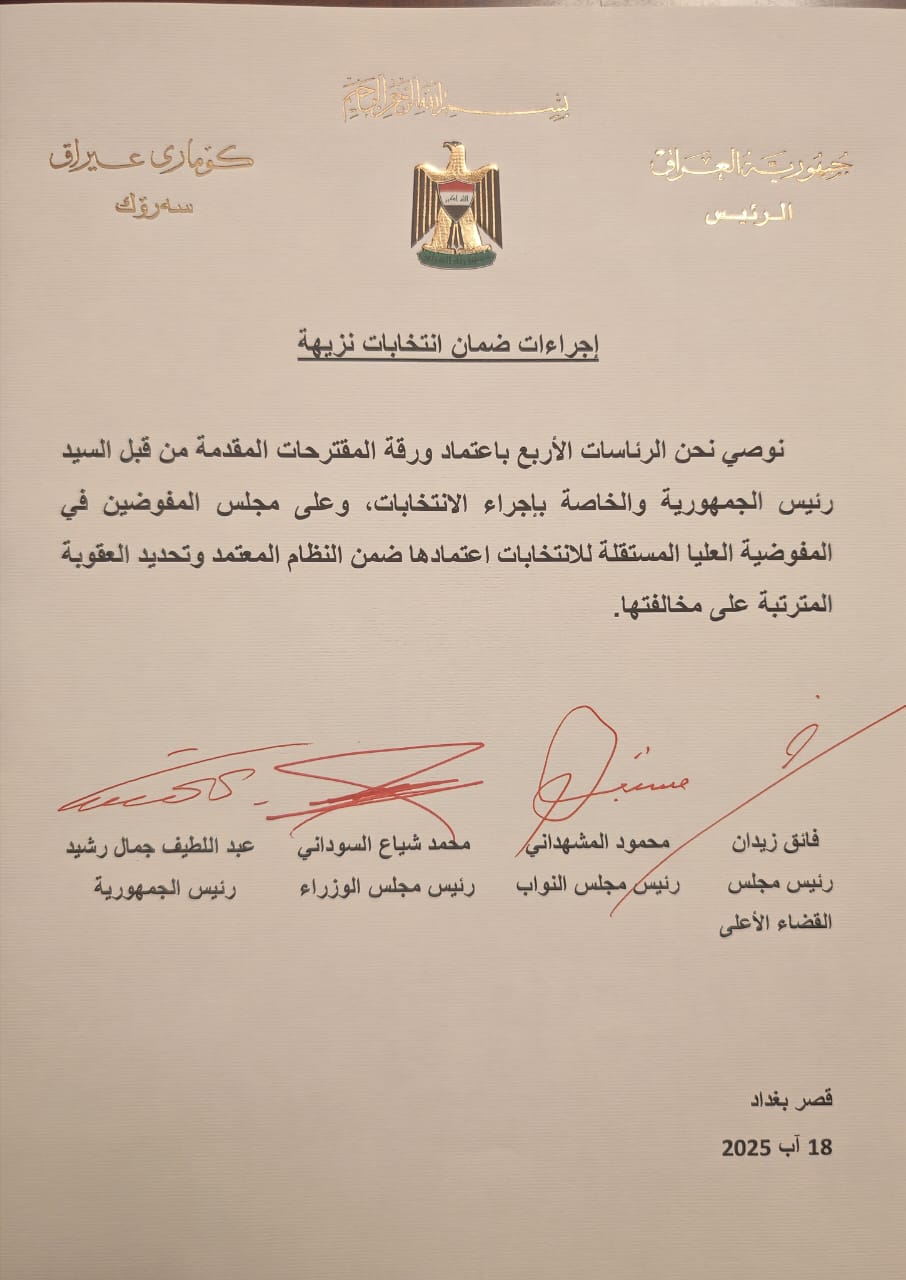 بالوثيقة.. الرئاسات الأربع خلال اجتماعها توصي المفوضية العليا المستقلة للانتخابات بتبني جملة احكام تعتمدها بنظامها يترتب على من يخالفها الحرمان من المشاركة في الانتخابات او عدم اعتماد النتائج التي حصل عليها في حال ثبوت المخالفة