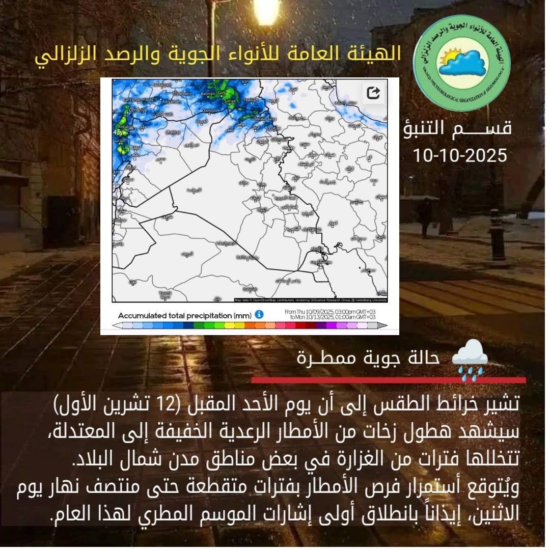 محلياتالأنواء الجوية: هطول أمطار رعدية في بعض المدن الشمالية يوم الأحد المقبل قبل 4 أسابيع 34 مشاهدات شارك الأنواء الجوية: هطول أمطار رعدية في بعض المدن الشمالية يوم الأحد المقبل الأنواء الجوية: هطول أمطار رعدية في بعض المدن الشمالية يوم الأحد المقبل الوسومأمطار رعديةالأنواء الجويةقد يهمك أيضا أمن نتيجة خلافات عشائرية.. مقتل شخص بإطلاق نار في منطقة الفضيلية شرقي بغداد قبل 3 دقائق 1 مشاهدة أمن بمشاركة القوة الجوية وطيران الجيش.. العمليات المشتركة تكشف خطة يومي الاقتراع الخاص والعام قبل 9 دقائق 3 مشاهدات رياضة "فيفا" يعلن قائمة المرشحين لجائزة أفضل لاعب في العالم 2025 قبل 44 دقيقة 8 مشاهدات عربي ودولي إصابة 54 شخصاً بانفجار في مسجد اثناء صلاة الجمعة في اندونيسيا قبل ساعة واحدة 14 مشاهدات عربي ودولي رئيس الوزراء اللبناني: هناك تقدم كبير في الأشهر الأخيرة فيما يتعلق بالاستقرار في لبنان قبل ساعة واحدة 7 مشاهدات