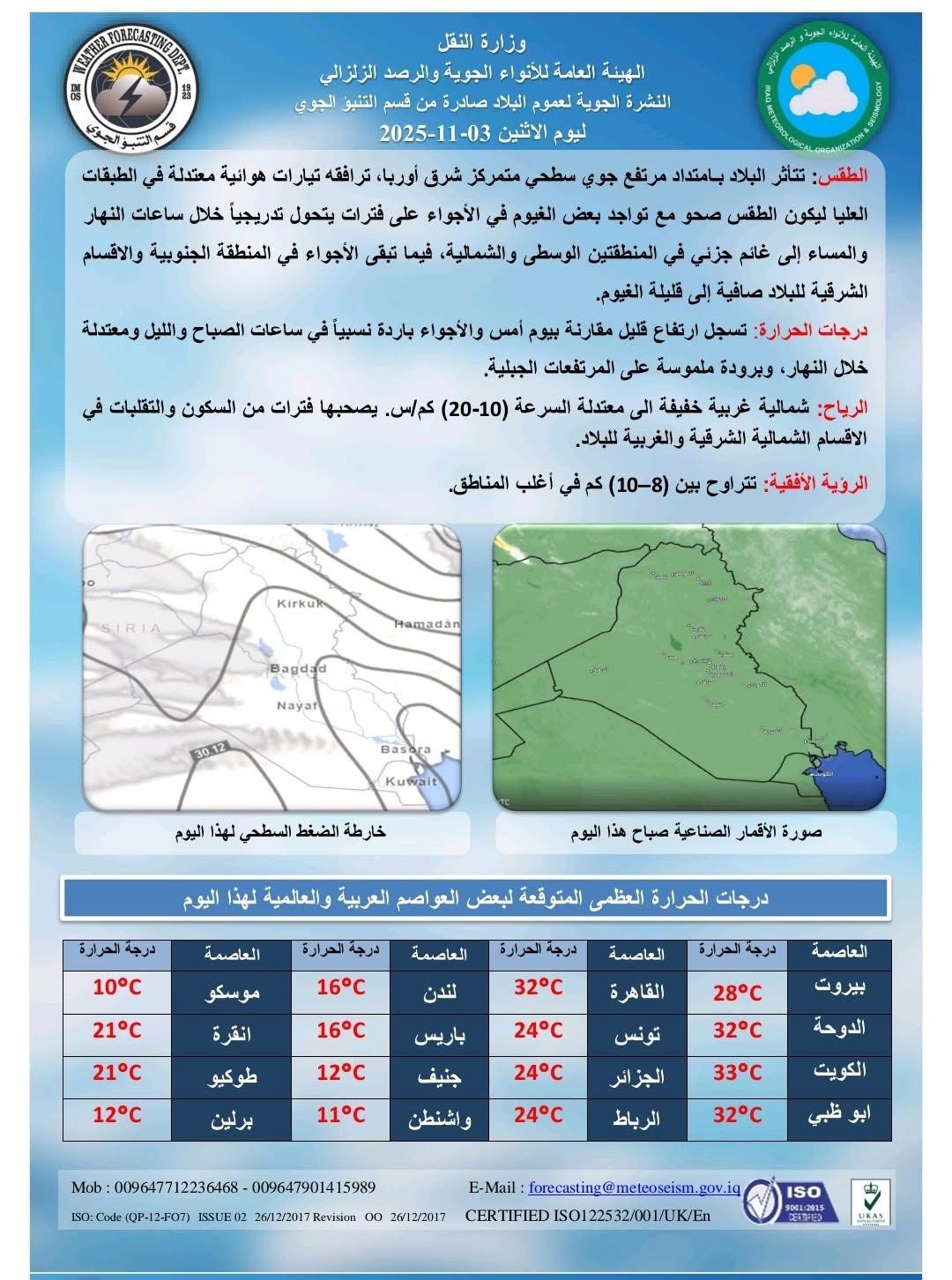 طقس العراق.. غيوم متفرقة وارتفاع درجات الحرارة خلال الأيام المقبلة