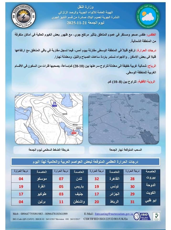 الوسومدرجات الحرارةطقس العراقغيوم متفرقة