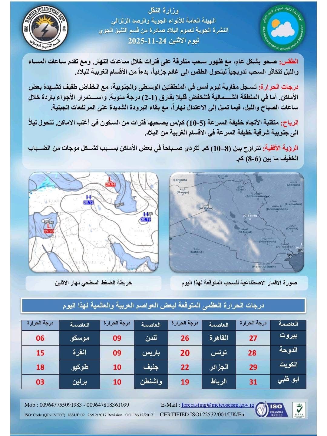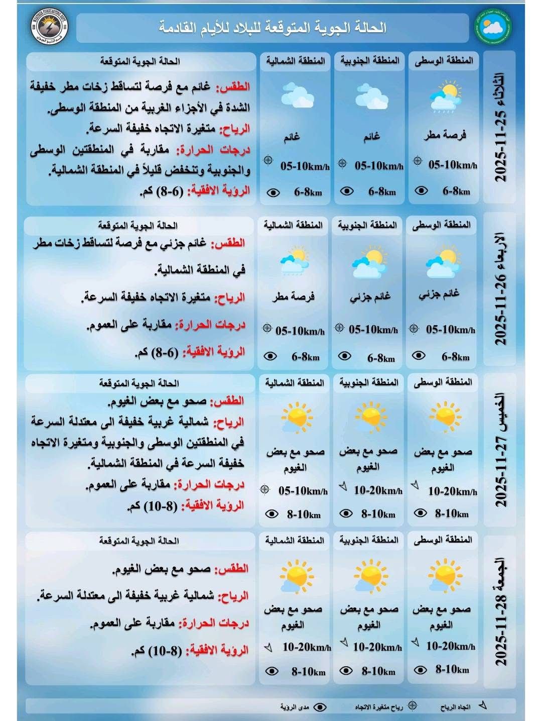 أعلنت هيئة الأنواء الجوية، حالة طقس العراق خلال الأيام المقبلة، فيما أشارت إلى أمطار وانخفاض بدرجات الحرارة خلال اليومين المقبلين.