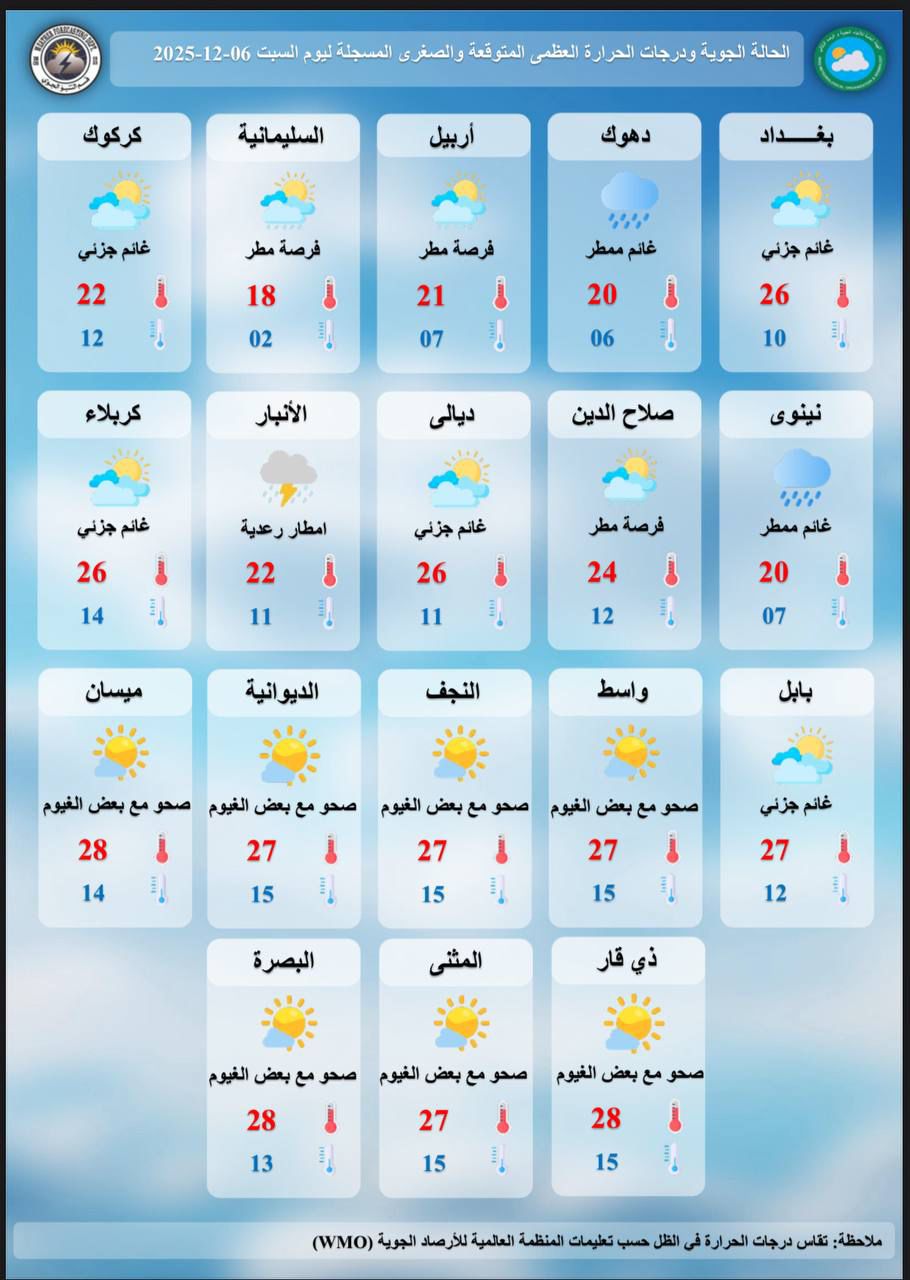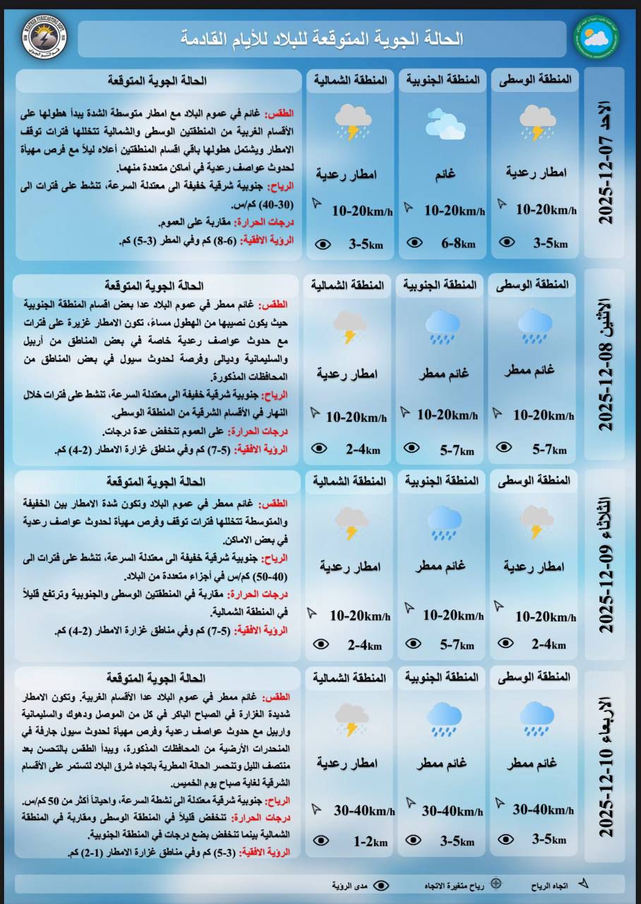 أعلنت هيئة الأنواء الجوية، اليوم السبت، عن تفاصيل حالة الطقس في البلاد للأيام المقبلة، فيما توقعت تساقطاً للأمطار الغزيرة وحدوث سيول وعواصف رعدية.