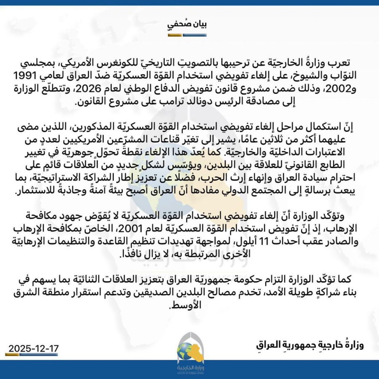 سياسةالعراق يرحب بالتصويت التاريخي للكونغرس على إلغاء تفويضي استخدام القوة العسكرية قبل ساعتين 6 مشاهدات شارك العراقالعراق يرحب بالتصويت التاريخي للكونغرس على إلغاء تفويضي استخدام القوة العسكرية الوسومالعراققد يهمك أيضا عربي ودولي الصحة العالمية: مقتل أكثر من 1600 شخص خلال هجمات على المراكز الصحية في السودان قبل دقيقتان 2 مشاهدات أقتصاد نتنياهو يعلن رسميًا المصادقة على اتفاق الغاز مع مصر بقيمة 35 مليار دولار قبل ساعة واحدة 9 مشاهدات الاخبار العاجلة الخارجية: العراق ملتزم بتعزيز العلاقات مع الولايات المتحدة بما يسهم في بناء شراكة طويلة الامد قبل ساعتين 7 مشاهدات سياسة رئيس باكستان "آصف علي زرداري" يزور العراق الأسبوع المقبل قبل ساعتين 8 مشاهدات محليات النجف تقرر تعطيل الدوام الرسمي للمدارس فقط يوم غدٍ الخميس بسبب سوء الأحوال الجوية قبل ساعتين 6 مشاهدات