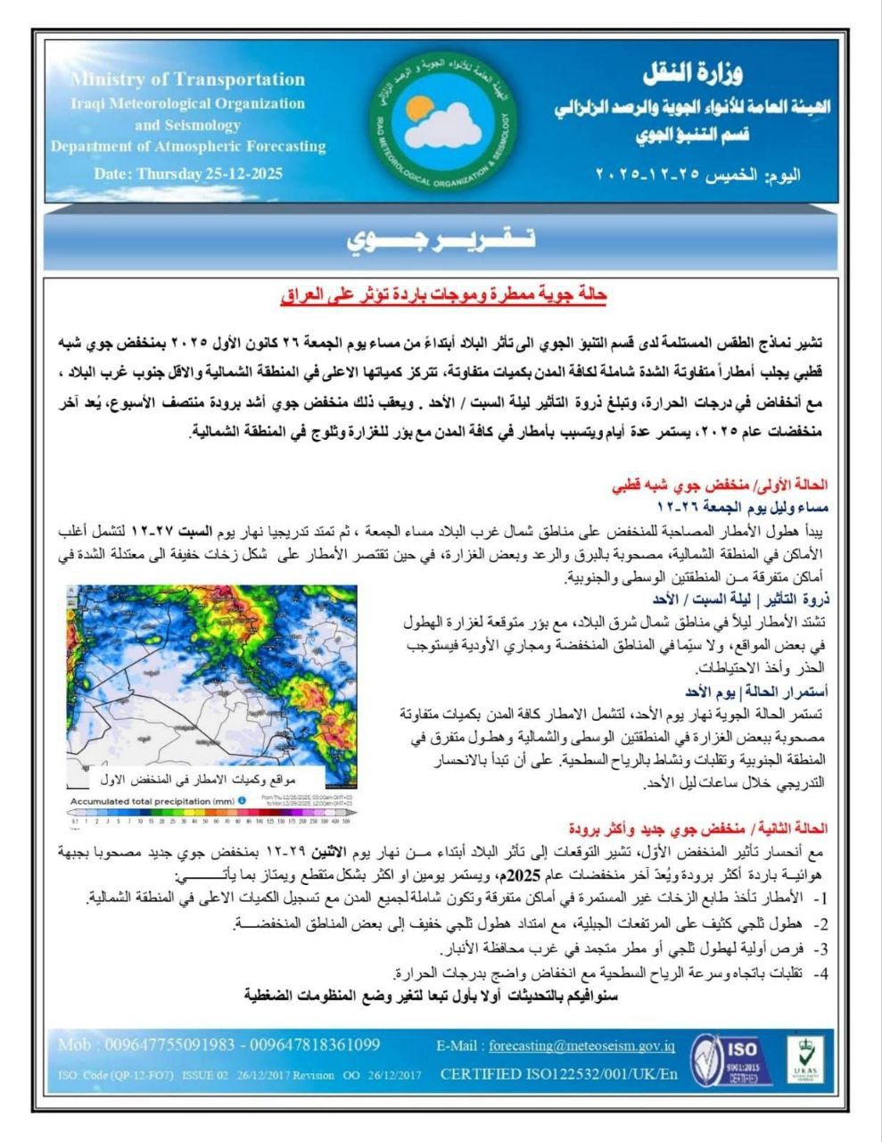 محلياتالانواء الجوية: العراق يتأثر بمنخفض شبه قطبي يتسبب بأمطار وتدني درجات الحرارة قبل ساعتين 11 مشاهدات شارك الانواء الجوية: العراق يتأثر بمنخفض شبه قطبي يتسبب بأمطار وتدني درجات الحرارة الانواء الجوية: العراق يتأثر بمنخفض شبه قطبي يتسبب بأمطار وتدني درجات الحرارة الوسومالانواء الجويةالعراقدرجات الحرارةقد يهمك أيضا أمن الداخلية تعلن تفكيك 176 شبكة دولية للمخدرات وتؤكد نجاح التعاون الإقليمي قبل 41 دقيقة 4 مشاهدات محليات الكهرباء: الإنتاج الحالي يصل لـ17 ألف ميغاواط قبل ساعتين 10 مشاهدات محليات الموارد: خطة لإنشاء 50 سداً لحصاد المياه غالبيتها في نينوى والأنبار قبل 3 ساعات 10 مشاهدات عربي ودولي الصحة اللبنانية: شهيد في غارة إسرائيلية على بلدة مجدل سلم جنوبي البلاد قبل 3 ساعات 11 مشاهدات الملف 13 جنود روسيا العراقيين.. ضحايا مدانين قبل 3 ساعات 8 مشاهدات