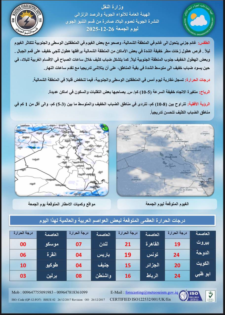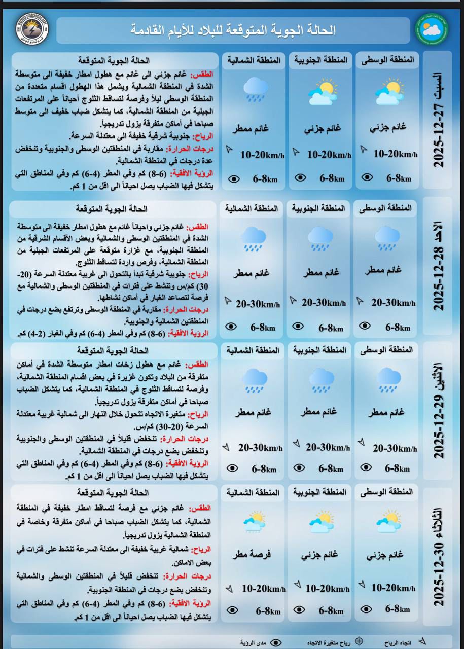 أعلنت هيئة الأنواء الجوية، حالة طقس العراق خلال الأيام المقبلة، فيما أشارت إلى أمطار وثلوج وضباب اعتباراً من الغد.