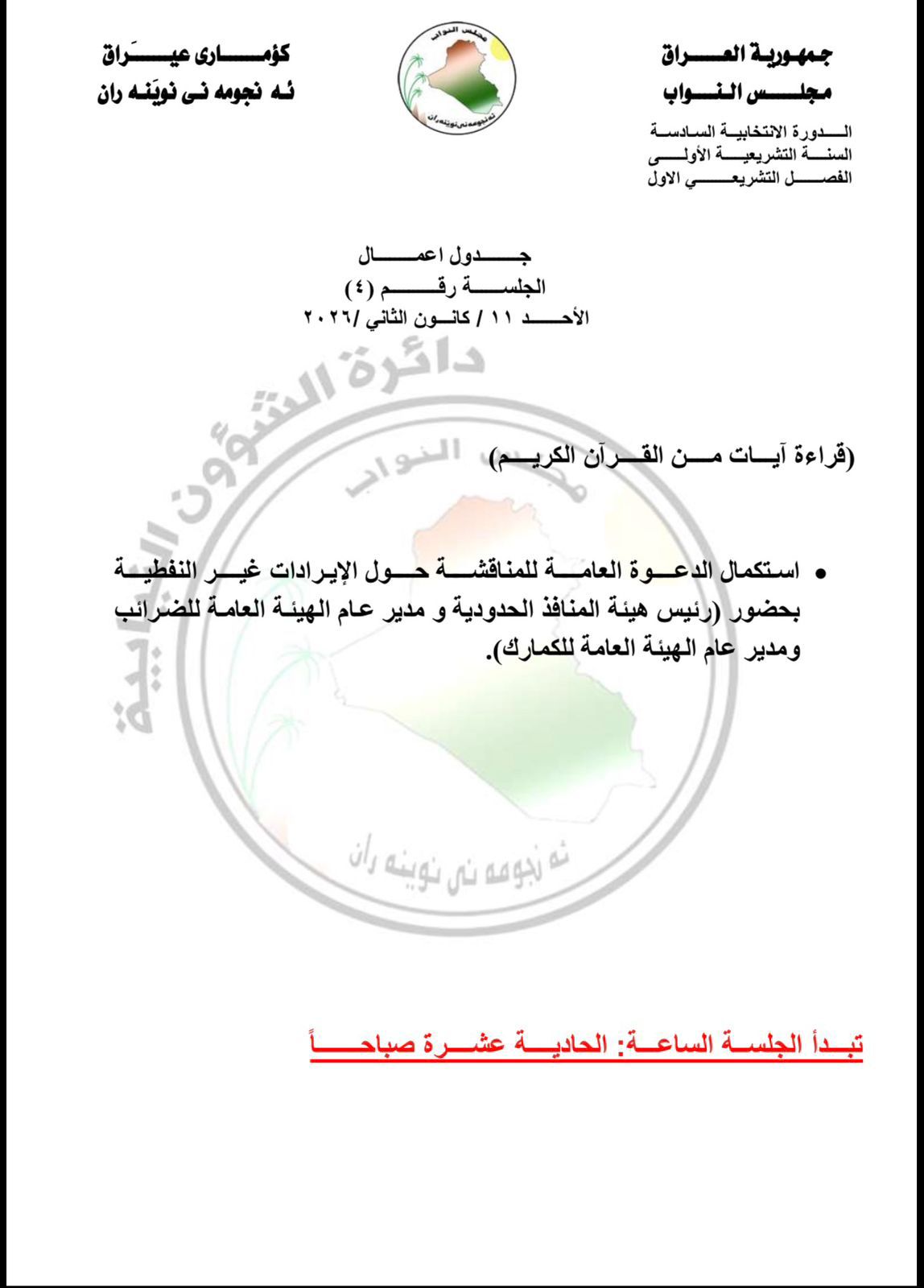 سياسةالبرلمان ينشر جدول اعمال جلسة غد الاحد قبل 12 ساعة 12 مشاهدات شارك رئيس البرلمان الشيخ هيبت الحلبوسي يؤكد أهمية الإسراع بتشكيل اللجان النيابيةالبرلمان ينشر جدول اعمال جلسة غد الاحد الوسوماعمالالبرلمانجدولقد يهمك أيضا ثقافة وفن وفاة الممثل السوري القدير أحمد مللي قبل 11 دقيقة 2 مشاهدات عربي ودولي في أول تصريح منذ اعتقاله.. مادورو: “أنا مقاتل”! قبل 18 دقيقة 1 مشاهدة محليات اختناقات مرورية تضرب العاصمة بغداد قبل 46 دقيقة 6 مشاهدات أمن الاطاحة بعصابة مختصة بترويج العملة الاجنبية المزورة والنصب على أصحاب المحال التجارية في ديالى قبل ساعة واحدة 9 مشاهدات محليات طقس العراق.. غيوم وأمطار وانخفاض في درجات الحرارة خلال الأيام المقبلة قبل ساعتين 8 مشاهدات