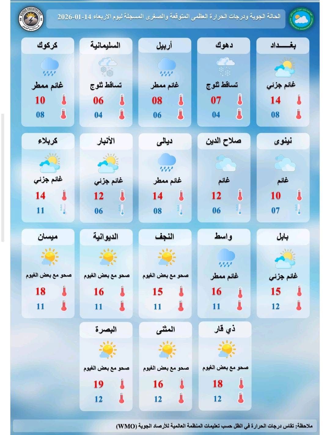 غداً.. فرص لهطول أمطار في عموم العراق وحرارة صغرى تقترب من الصفر ببعض المحافظات قبل 3 ساعات شارك غداً.. فرص لهطول أمطار في عموم العراق وحرارة صغرى تقترب من الصفر ببعض المحافظات