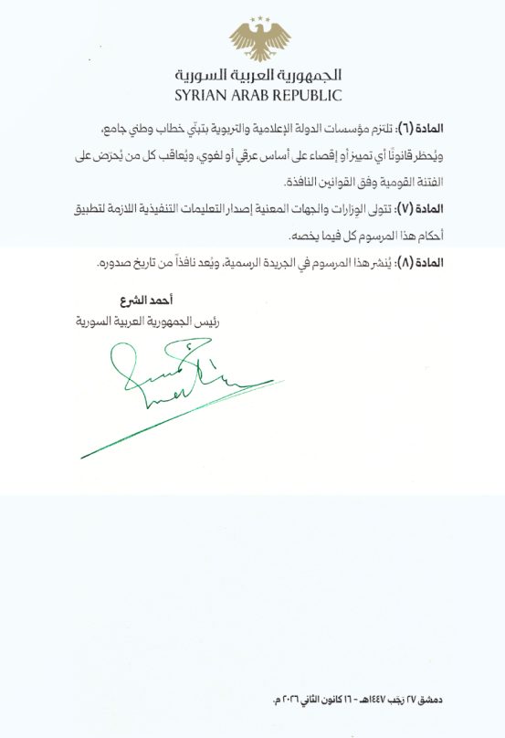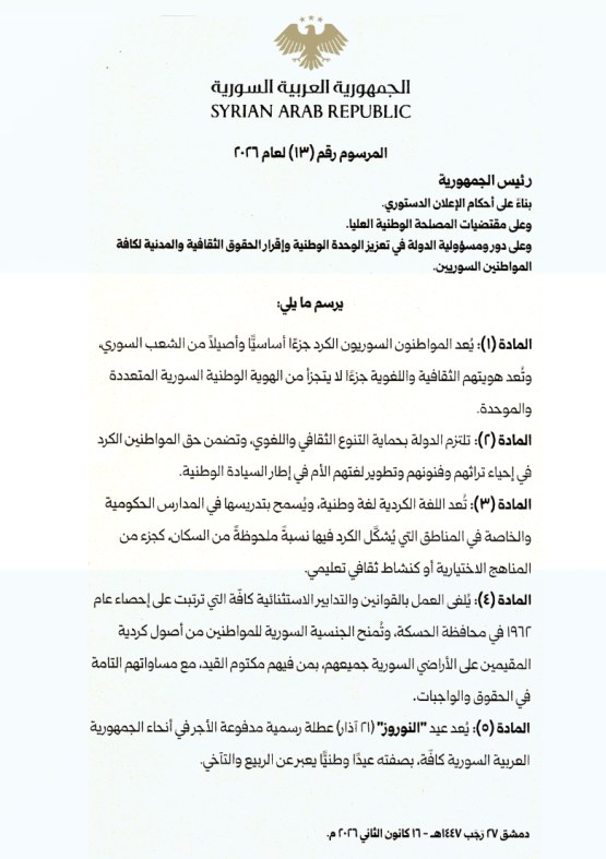 أصدر الرئيس السوري أحمد الشرع مرسوما يؤكد أن المواطنين السوريين الكرد جزء أساسي وأصيل من الشعب السوري، وأن هويتهم الثقافية واللغوية جزء لا يتجزأ من الهوية الوطنية.
