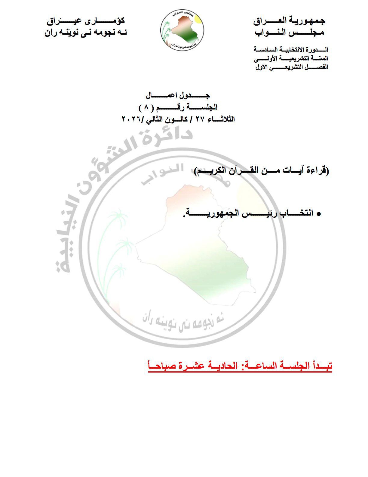 سياسةمخصصة لانتخاب رئيس الجمهورية.. البرلمان ينشر جدول أعمال جلسة الثلاثاء قبل ساعتين 6 مشاهدات شارك مخصصة لانتخاب رئيس الجمهورية.. البرلمان ينشر جدول أعمال جلسة الثلاثاءمخصصة لانتخاب رئيس الجمهورية.. البرلمان ينشر جدول أعمال جلسة الثلاثاء الوسومئيس الجمهوريةالبرلمانالثلاثاءجدولرئيس الجمهوريةقد يهمك أيضا أمن الداخلية: العراق يتقدم ثلاثة مراكز في التصنيف الأمني للأمم المتحدة قبل 14 دقيقة 4 مشاهدات أمن النعمان: نقل معتقلي داعش الى العراق قرار سيادي اتخذته الحكومة لتحقيق مصالح أمنية وقضائية قبل 36 دقيقة 5 مشاهدات أمن الاعرجي: تماسك المجتمع الدولي يُعد ضرورة أساسية للقضاء على الجماعات الإرهابية قبل 44 دقيقة 4 مشاهدات أمن بغداد وواشنطن تبحثان التعاون في مجال مكافحة الإرهاب وملف نقل سجناء داعش إلى العراق قبل 47 دقيقة 5 مشاهدات عربي ودولي الجيش السوري يعلن فتح ممرين إنسانيين في الحسكة وعين العرب قبل ساعة واحدة 5 مشاهدات