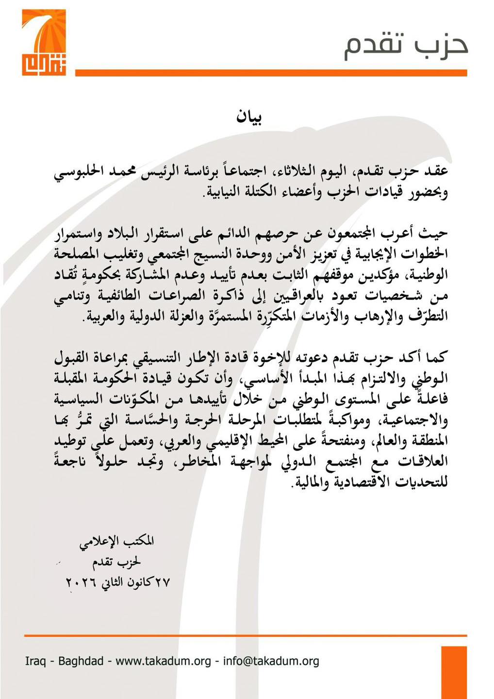 سياسةحزب تقدم يؤكد موقفه بعدم المشاركة بحكومة تقاد من شخصيات تعود بالعراقيين إلى ذاكرة الصراعات الطائفية وتنامي الإرهاب قبل ساعة واحدة 5 مشاهدات شارك قد يهمك أيضا عربي ودولي للمرة الثانية.. إسرائيل ترش “مواد مجهولة” على الأراضي الزراعية جنوبي سوريا قبل 25 دقيقة 4 مشاهدات رياضة إسبانيا تخطف استضافة نهائي كأس العالم 2030 من المغرب قبل 30 دقيقة 6 مشاهدات سياسة مجلس الوزراء يوافق على استمرار صرف الرواتب والمستحقات الخاصة بضحايا الإرهاب قبل 52 دقيقة 7 مشاهدات سياسة مجلس النواب: تأجيل جلسة انتخاب رئيس الجمهورية جاء لعدم اكتمال النصاب وحضور 85 نائباً قبل ساعة واحدة 6 مشاهدات أقتصاد توقف واردات الكهرباء الإيرانية إلى العراق بالكامل قبل ساعة واحدة 9 مشاهدات