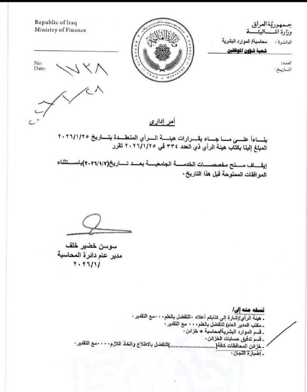 محلياتوزارة المالية توقف مخصصات الخدمة الجامعية بعد 2 كانون الثاني 2026 قبل ساعتين 14 مشاهدات شارك المالية النيابية: أجور الساعات الإضافية للموظف تتراوح بين 150 إلى 400 ألف دينار شهرياوزارة المالية توقف مخصصات الخدمة الجامعية بعد 2 كانون الثاني 2026 الوسومتوقفكانونوزارة الماليةقد يهمك أيضا محليات السيد الصدر يوجه بإقامة مضيف آل الصدر في لبنان: لا تستخدموه للأمور الدنيوية والسياسية قبل 11 دقيقة 3 مشاهدات محليات التربية تعلن إطلاق الرواتب دون وجود استقطاعات قبل 16 دقيقة 3 مشاهدات عربي ودولي غوتيريش يحذر في رسالة إلى الدول الأعضاء من انهيار مالي وشيك للأمم المتحدة قبل 34 دقيقة 3 مشاهدات عربي ودولي ماكرون: سندعم تنفيذ اتفاق وقف إطلاق النار في سوريا قبل ساعة واحدة 6 مشاهدات سياسة نيجيرفان بارزاني مُرحباً باتفاق قسد ودمشق: يمهد أرضية صلبة للاستقرار قبل ساعة واحدة 7 مشاهدات