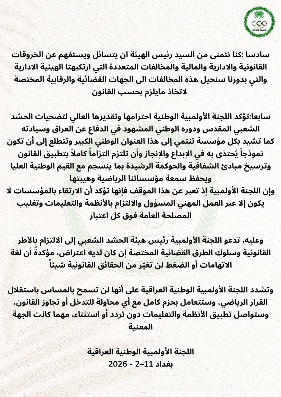 رياضةاللجنة الاولمبية: الاجراءات بحق نادي الحشد الشعبي قانونية واتهامات رئيس الهيئة باطلة ومرفوضة قبل ساعتين 8 مشاهدات شارك اللجنة الاولمبية: الاجراءات بحق نادي الحشد الشعبي قانونية واتهامات رئيس الهيئة باطلة ومرفوضة الوسومالحشد الشعبياللجنة الاولمبيةحشد الشعبيرئيسقد يهمك أيضا الاخبار العاجلة السوداني والمالكي يبحثان جهود التوصل الى اتفاق سياسي يستكمل اختيار رئيس الجمهورية قبل ساعتين 11 مشاهدات الاخبار العاجلة سرايا السلام تعلن القبض على ارهابي ينتمي لداعش في صلاح الدين قبل ساعتين 8 مشاهدات الاخبار العاجلة رئيس اركان الجيش: أمن الحدود العراقية يمثل أولوية أساسية لدى القوات المسلحة قبل 3 ساعات 14 مشاهدات عربي ودولي ترامب: فشل المفاوضات لن يكون في صالح ايران قبل 3 ساعات 10 مشاهدات عربي ودولي ترامب: أصر على استمرار المفاوضات مع ايران وعليهم ان يكونوا أكثر عقلانية هذه المرة قبل 3 ساعات 7 مشاهدات
