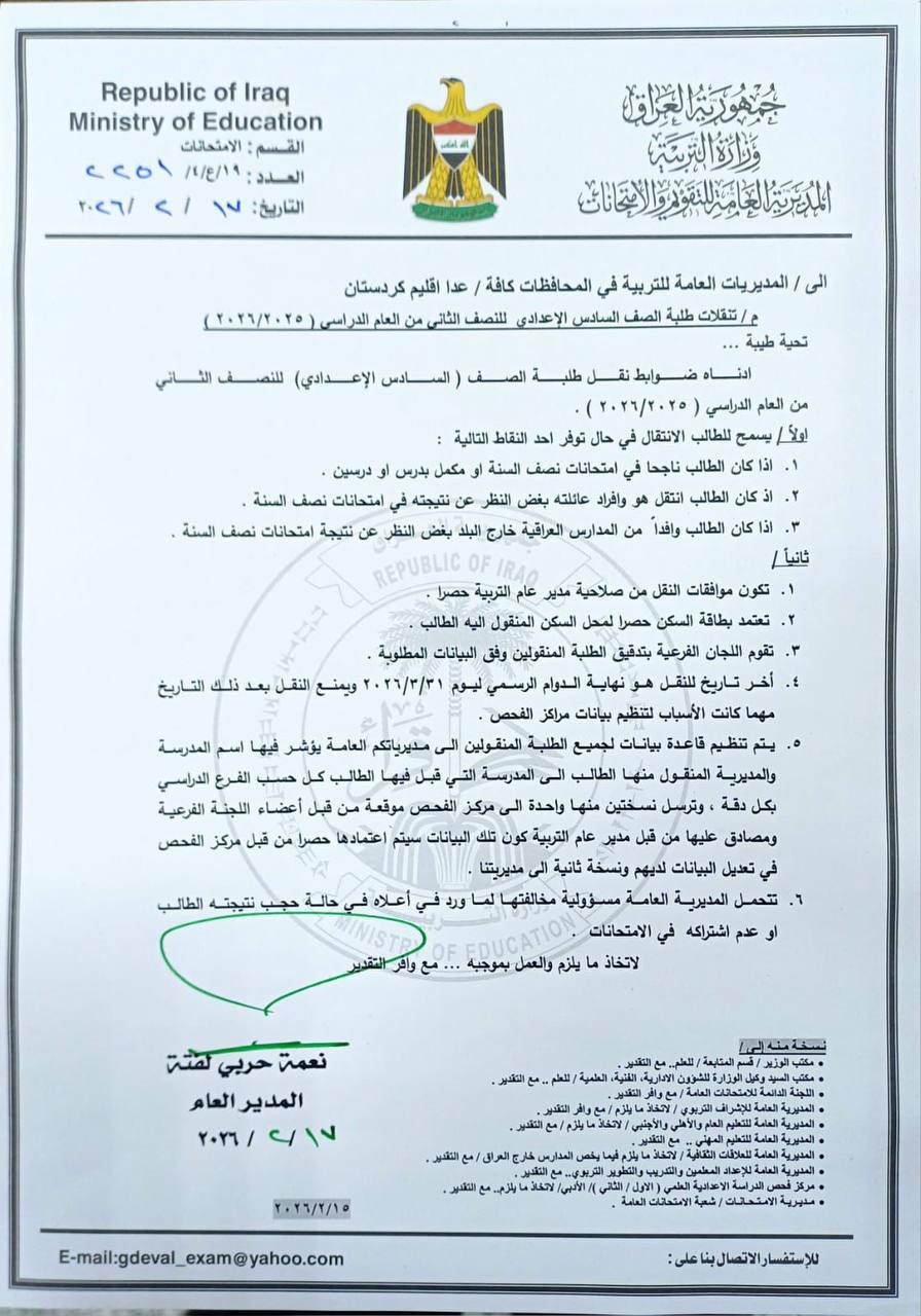 محلياتالتربية تحدد ضوابط نقل طلبة السادس الإعدادي للنصف الثاني من العام الدراسي 2025_2026 قبل ساعتين 15 مشاهدات شارك وزارة التربية الوسومالتربيةالسادس الإعداديالعام الدراسيضوابطقد يهمك أيضا عربي ودولي انتهاء الجولة الثانية من المحادثات بين الولايات المتحدة وإيران في جنيف قبل دقيقتان عربي ودولي الاتحاد الأوروبي يكشف: سندرب 2500 عنصر أمن في غزة قبل 7 دقائق 5 مشاهدات أمن يكسر زجاج السيارات ويسرق محتوياتها.. الإطاحة بالملقب بـ(أبو جاكوج) وسط بغداد قبل 16 دقيقة 7 مشاهدات سياسة الرشيد تنشر اسماء اللجان النيابية الدائمة في مجلس النواب العراقي قبل 16 دقيقة 4 مشاهدات عربي ودولي السلطات السورية تبدأ بإخلاء مخيم الهول الذي يضم عائلات عناصر داعش قبل 37 دقيقة 6 مشاهدات
