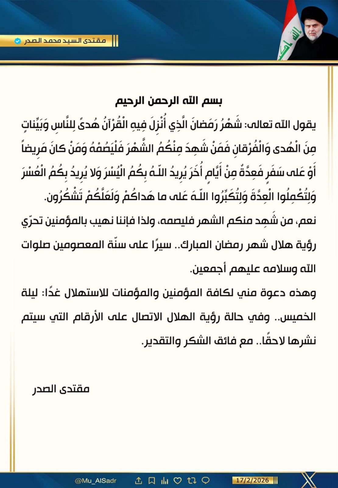 محلياتالسيد الصدر يدعو لتحري هلال شهر رمضان غدًا قبل ساعتين 14 مشاهدات شارك السيد الصدر: لن نسكت مستقبلًا على ضياع الواجبات والحقوق وما زلنا طلاب إصلاح وإنقاذ العراقالسيد الصدر يدعو لتحري هلال شهر رمضان غدًا الوسومالسيد الصدرشهر رمضانهلال شهر رمضانقد يهمك أيضا عربي ودولي “أكسيوس”: إيران تعرض العودة بمقترحات مفصلة بشأن المفاوضات خلال أسبوعين قبل 8 دقائق 2 مشاهدات أقتصاد مجلس الوزراء يقرر فرض رسم جمركي بمقدار 20% على الأكواب الورقية المستوردة قبل 50 دقيقة 7 مشاهدات سياسة “الرشيد” تنشر نص قرارات مجلس الوزراء في جلسة اليوم قبل 53 دقيقة 7 مشاهدات رياضة مورينيو يوجه رسالة تحذيرية للاعبي بنفيكا قبل مواجهة ريال مدريد قبل ساعتين 9 مشاهدات عربي ودولي مصر تعلن الخميس المقبل أول أيام شهر رمضان قبل ساعتين 19 مشاهدات