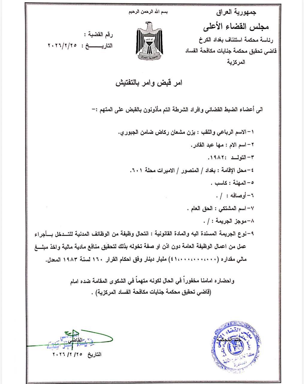 الاخبار العاجلةبالوثيقة.. أمر قبض بحق “يزن مشعان الجبوري” بتهمة انتحال صفة وظيفية قبل ساعتين 15 مشاهدات شارك بالوثيقة.. أمر قبض بحق "يزن مشعان الجبوري" بتهمة انتحال صفة وظيفية الوسومانتحال صفةبالوثيقةقبضمشعان الجبوريقد يهمك أيضا عربي ودولي الرئيس الإيراني: لا نسعى إلى امتلاك سلاح نووي وملتزمون بفتوى المرشد في هذا الشأن قبل 11 دقيقة 2 مشاهدات محليات الأنواء الجوية: أمطار رعدية وغبار وانخفاض في درجات الحرارة غداً الجمعة قبل ساعة واحدة 10 مشاهدات سياسة الإعمار والتنمية النيابية تدعو رئاسة البرلمان لعقد جلسة انتخاب رئيس الجمهورية الأسبوع المقبل قبل ساعة واحدة 9 مشاهدات أقتصاد ارتفاع أسعار النفط قرب أعلى مستوياتها في 7 أشهر قبل ساعتين 8 مشاهدات محليات السيد الصدر: المسحراتي ولعب المحيبس وقول رمضان كريم عادات سيئة ليس لها منشأ شرعي قبل 10 ساعات 24 مشاهدات