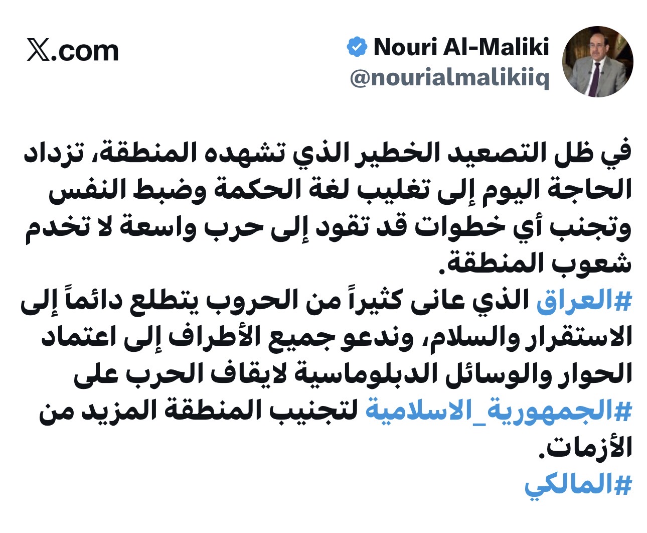 الاخبار العاجلةالمالكي: العراق عانى كثيراً من الحروب ويتطلع دائماً إلى الاستقرار والسلام قبل ساعتين 14 مشاهدات شارك المالكي: العراق عانى كثيراً من الحروب ويتطلع دائماً إلى الاستقرار والسلام الوسومالاستقرارالعراقالمالكيقد يهمك أيضا أمن رويترز: هجوم بمسيرة على حقل نفط تديره شركة أميركية في اقليم كردستان قبل 29 دقيقة 9 مشاهدات الاخبار العاجلة وزير الخارجية يؤكد التزام الحكومة بحماية البعثات الدبلوماسية العاملة في العراق قبل ساعة واحدة 10 مشاهدات الاخبار العاجلة وزير الخارجية يؤكد للقائم بالأعمال الأمريكي حرص العراق على إبعاد تداعيات الحرب عنه قبل ساعة واحدة 10 مشاهدات الاخبار العاجلة المالكي: ندعو جميع الأطراف إلى اعتماد الحوار والوسائل الدبلوماسية لايقاف الحرب قبل ساعتين 12 مشاهدات الاخبار العاجلة نائب قائد العمليات المشتركة: لن نسمح بتواجد أية قوة تضر بالعراق ومصلحته وأمنه قبل ساعتين 11 مشاهدات