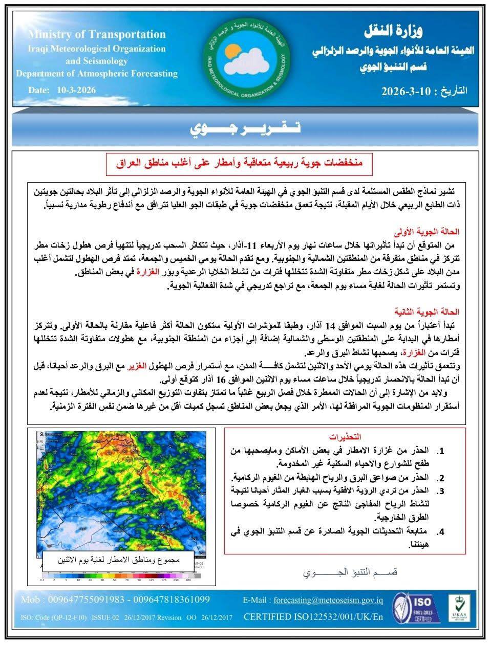 محلياتالأنواء الجوية: هطول أمطار ابتداءً من يوم غد الأربعاء إلى الإثنين المقبل قبل ساعتين 10 مشاهدات شارك الوسومأمطارالأنواء الجويةقد يهمك أيضا عربي ودولي ترامب: لم تردنا أي تقارير عن زرع إيران لألغام في مضيق هرمز قبل 54 ثانية عربي ودولي الصحة العالمية تحذر من مخاطر “المطر الأسود” في إيران قبل 58 دقيقة 9 مشاهدات عربي ودولي وزير الطاقة الأمريكي يحذف منشورًا عن مرافقة قوات بلاده ناقلة نفط في مضيق هرمز قبل ساعة واحدة 9 مشاهدات عربي ودولي الحرس الثوري الايراني ينفي نجاح القوات الأمريكية في تأمين مرور ناقلة عبر مضيق هرمز قبل ساعة واحدة 9 مشاهدات أمن العمليات المشتركة: الوضع الأمني مستقر ولا يوجد أي انتشار استثنائي خارج إطار الخطط الأمنية قبل ساعة واحدة 7 مشاهدات