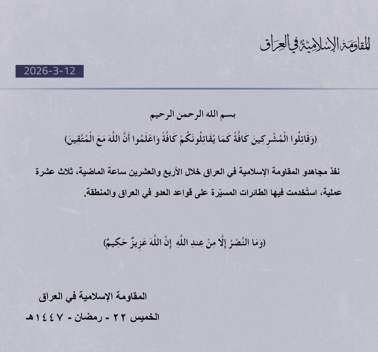 نفذ مجاهدو المقاومة الإسلامية في العراق خلال الأربع والعشرين ساعة الماضية، ثلاث عشرة عملية، استُخدمت فيها الطائرات المسيّرة على قواعد العدو في العراق والمنطقة.